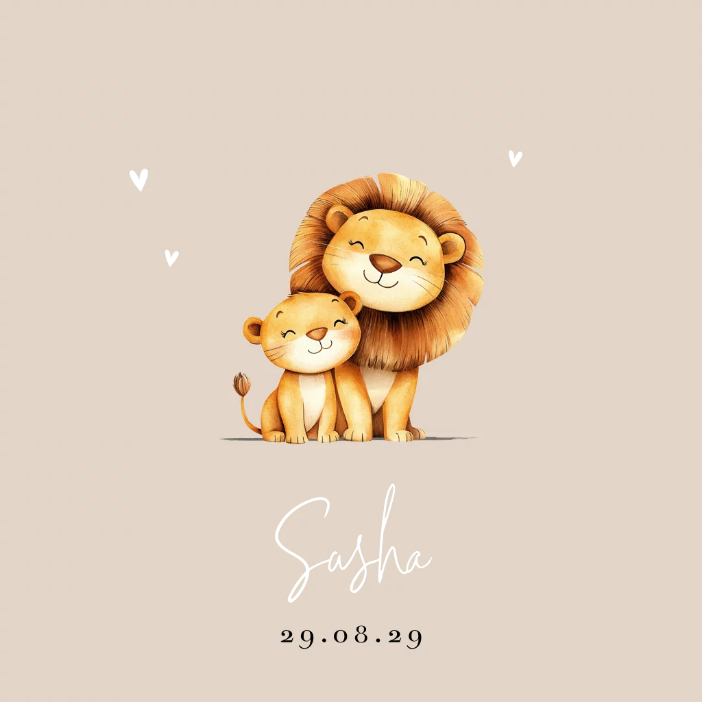 Trotse leeuwenliefde op z’n mooist! Op dit warme geboortekaartje staan twee schattige leeuwtjes zij aan zij, een grote en een kleine. De vrolijke illustratie wordt prachtig aangevuld met een glanzende naam in luxe goudfolie. Een stijlvol en liefdevol ontwerp voor jullie kleine krachtpatser. Pas de kaart eenvoudig aan in onze kaartenmaker.