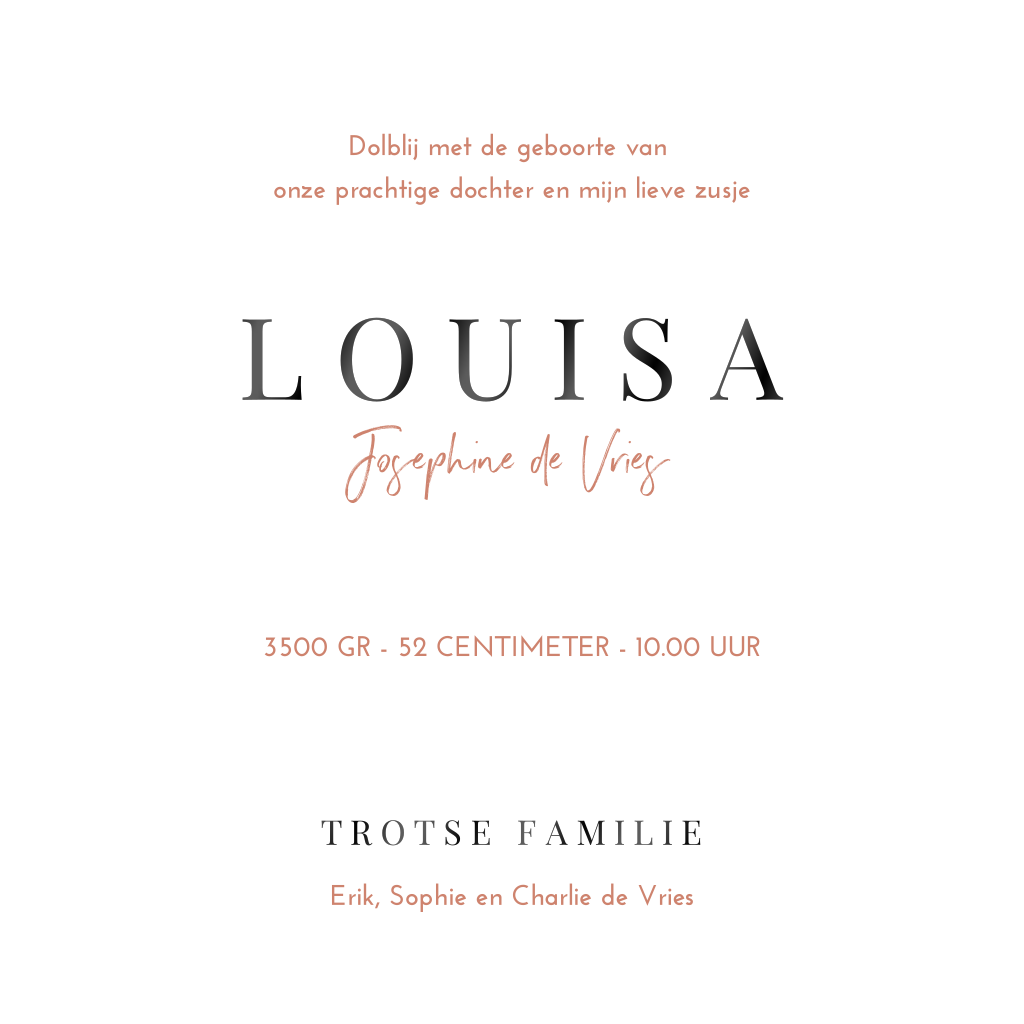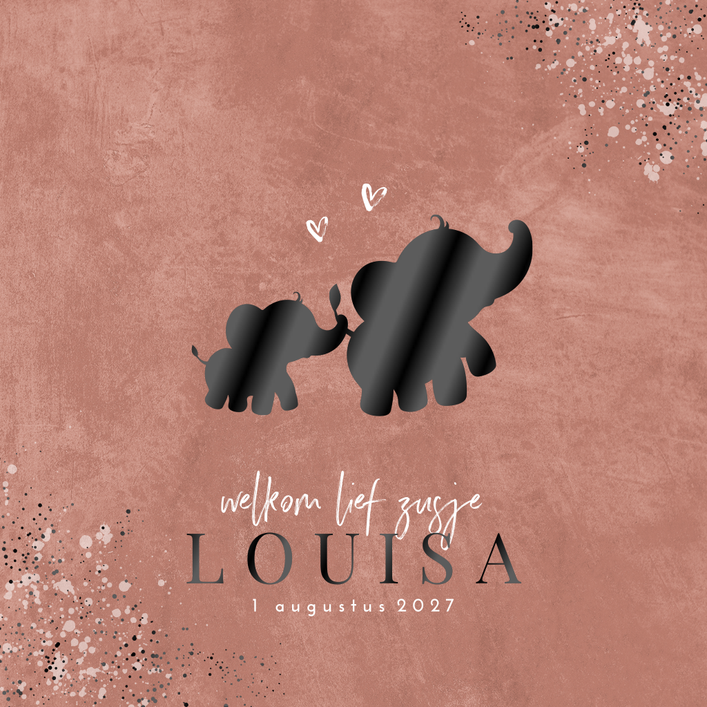 Stoer geboortekaartje voor een klein zusje met spetters, twee olifantjes en klassieke typografie. De olifantjes, de naam en een deel van de spetters worden in hoogglans zwart gedrukt. Een origineel kaartje om de komst van een zusje mee aan te kondigen! Je kunt de hoogglanskleur eventueel ook wijzigen in onze ontwerptool, bijvoorbeeld naar foliedruk.