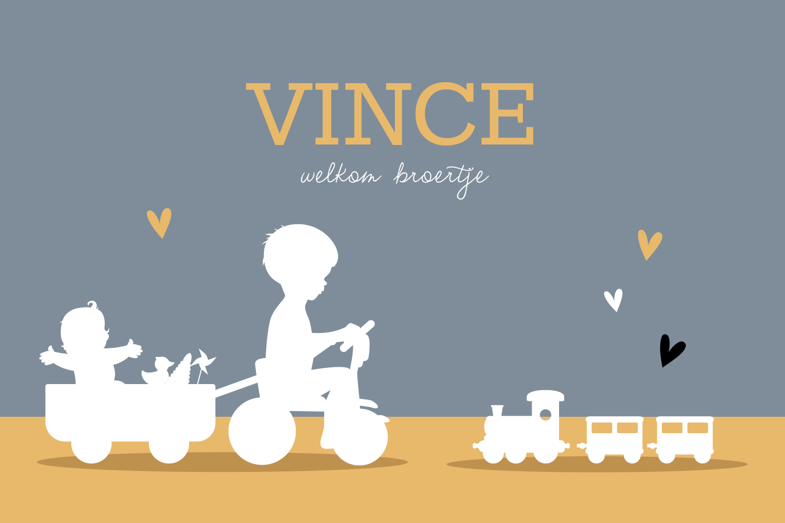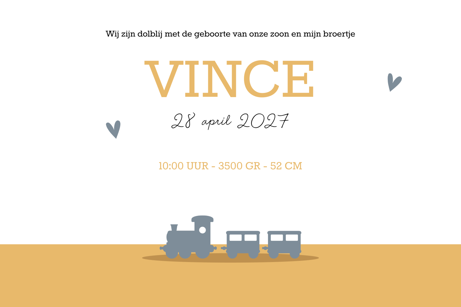 Dit geboortekaartje heeft een lief silhouet van twee broertjes op de fiets voorop. De blauwe en gele kleur geven de kaart een trendy uitstraling, maar deze kan je naar eigen wens aanpassen. In de kaart keert het treintje van de voorzijde terug en is er voldoende ruimte voor het plaatsen van alle gegevens.