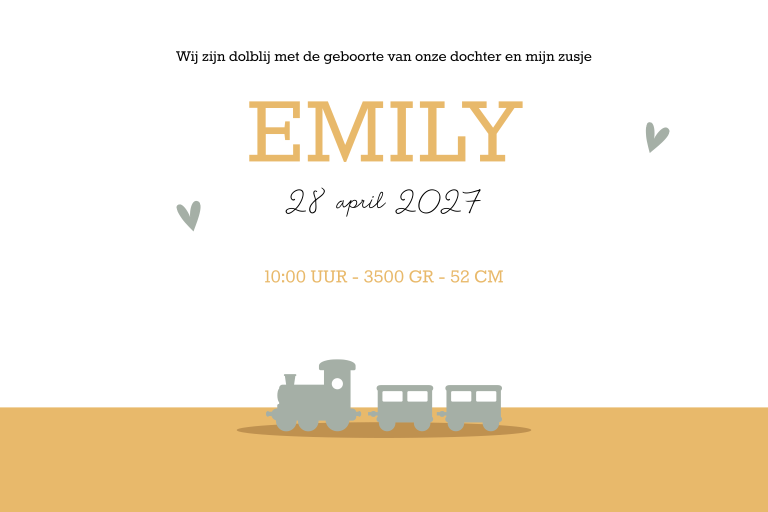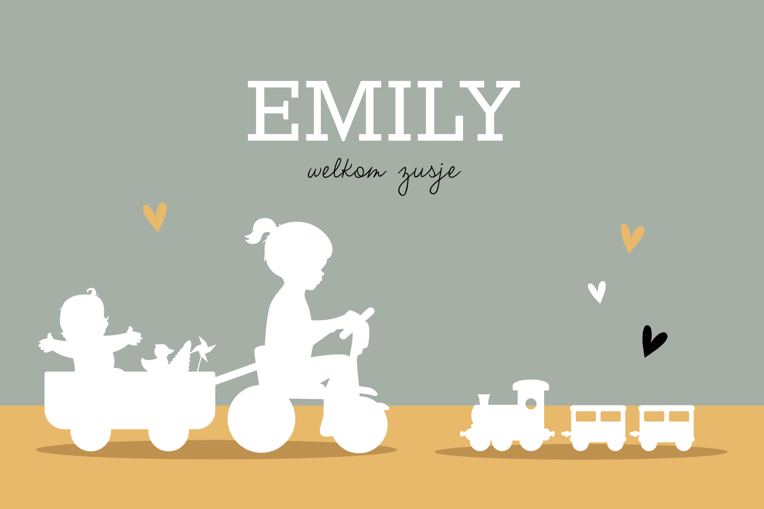 In verwachting van je tweede dochter? Daar hoort natuurlijk een mooi geboortekaartje bij. Dit hippe ontwerp heeft een mooie groene achtergrond en een lieve illustratie van een zus met haar babyzusje op de fiets. In de kaart kun je alle informatie kwijt. Pas de kaart naar wens aan door bijvoorbeeld andere silhouetjes toe te voegen. Zo maak je de kaart nog unieker.