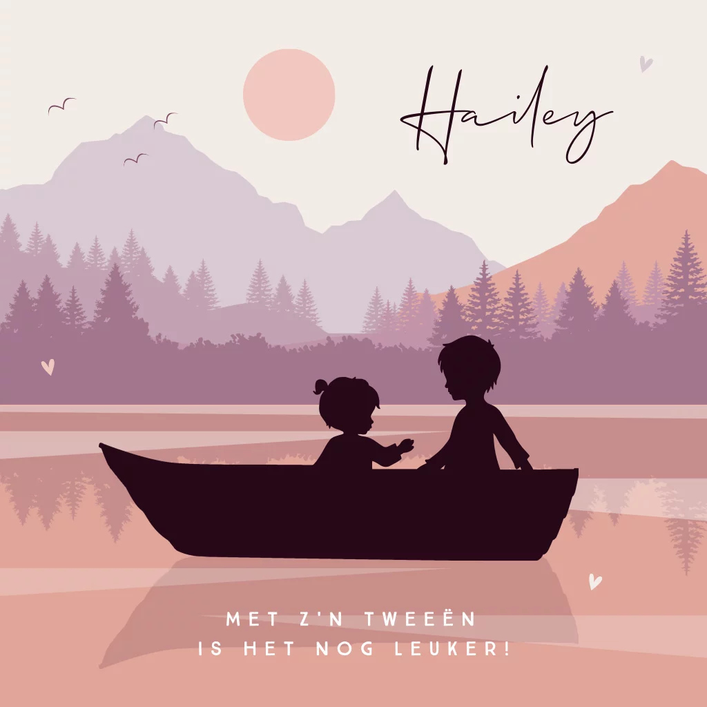 Is er een klein zusje op komst? Ga voor dit silhouet geboortekaartje met grote broer en klein zusje in een bootje. De twee kindjes varen in een roeibootje over een meer tussen de bergen en bomen. De kleuren kun je zelf wijzigen in onze handige editor.