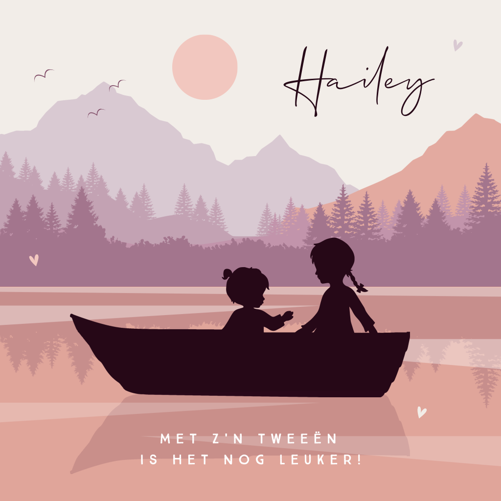 Is er een klein zusje op komst? Ga voor dit silhouet geboortekaartje met twee zusjes in een bootje. De grote zus en haar baby zusje varen in een roeibootje over een meer tussen de bergen en bomen. De kleuren kun je zelf wijzigen in onze handige editor.
