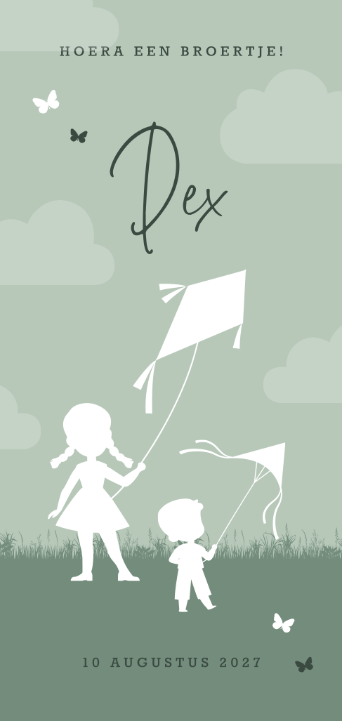Komt er een tweede kindje aan? Wat leuk! Kondig zijn komst aan met dit vrolijke geboortekaartje in groene tinten. Op het kaartje staan twee silhouetjes, vrolijk vliegerend in een landschapje. Een zus en baby broertje, omringd door wolkjes en vlindertjes. Pas alle kleuren eenvoudig aan in onze ontwerptool of verander de lettertypes. Bestel een proefdruk om te zien hoe deze kaart er in het echt uit komt te zien.