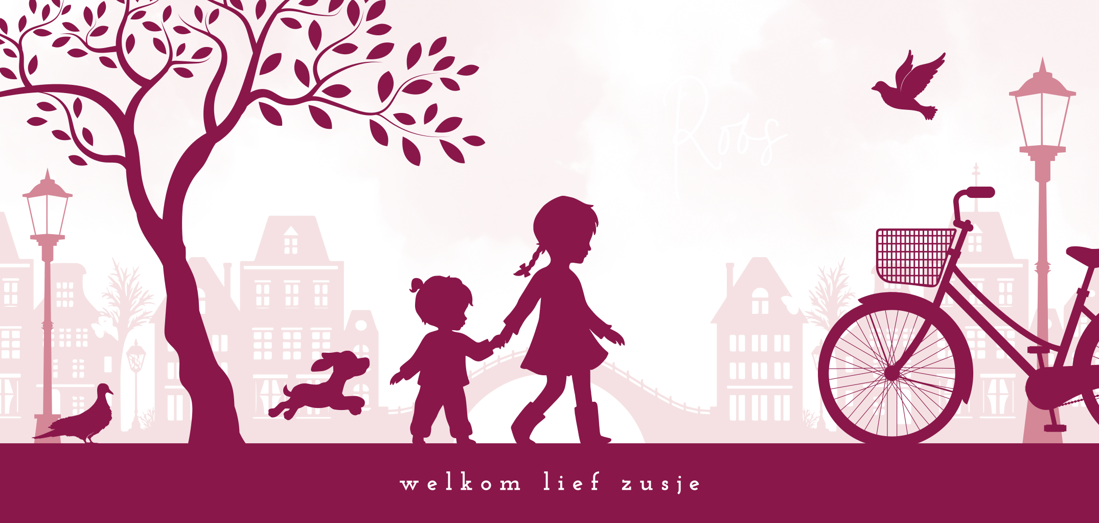 Op zoek naar een leuk geboortekaartje voor je tweede dochtertje? Ga voor dit roze ontwerp met silhouetjes en goudfolie. Een grote zus en haar kleine zusje lopen door een Nederlandse stad, zoals Amsterdam, Leiden of Utrecht. Een klein hondje huppelt vrolijk achter ze aan. De naam van je dochtertje komt in goudfolie letters voorop. De kleine, goudfolie vlindertjes maken het helemaal af! Pas dit ontwerp zelf aan in onze ontwerptool.