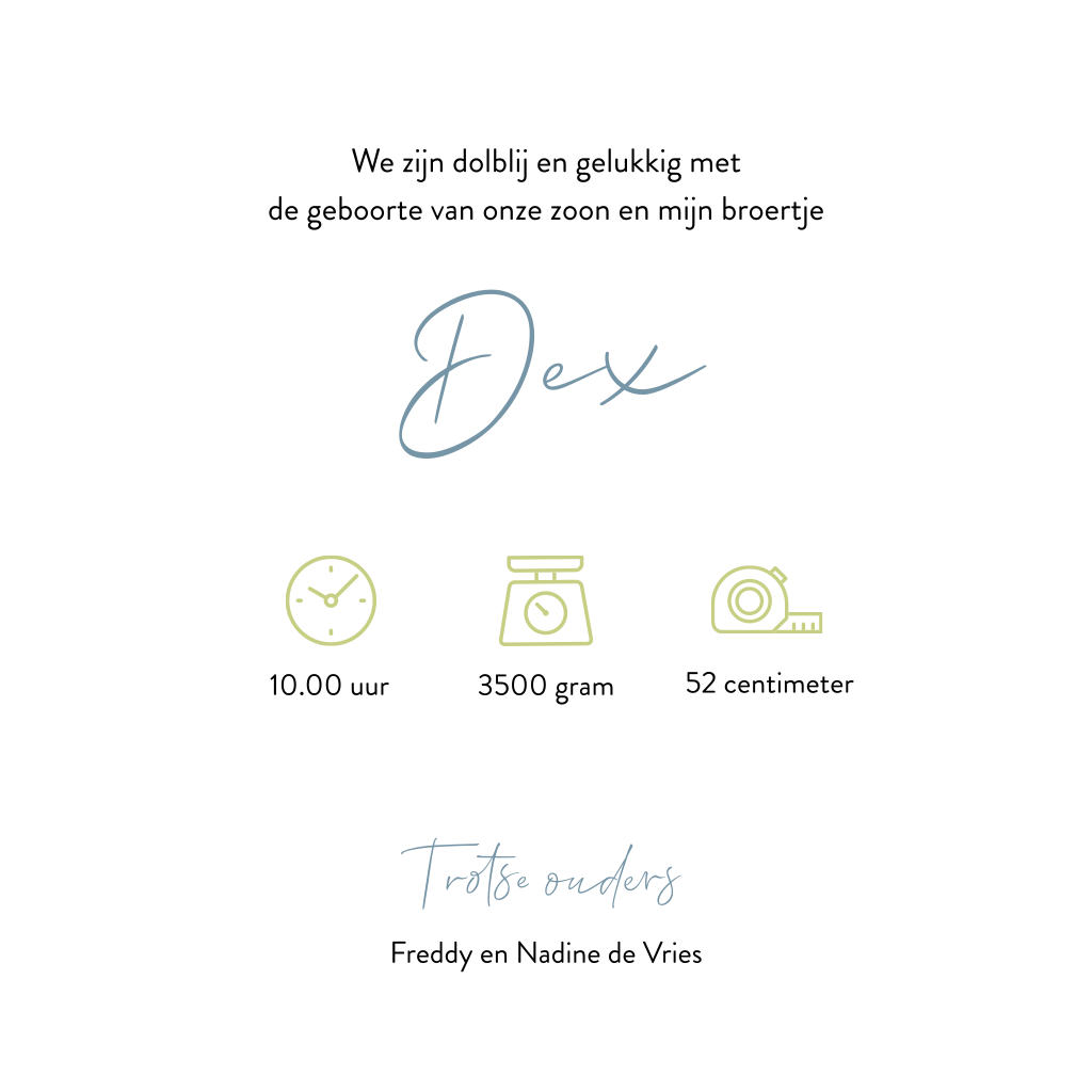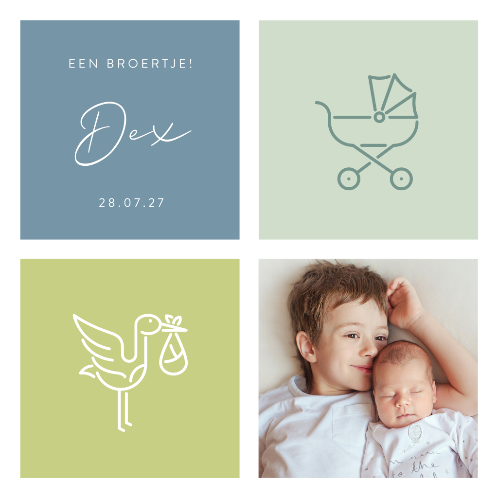 Hoera, er is weer een jongetje op komst! Met dit leuke geboortekaartje kan je alle kanten op. Zo kan je zelf een mooie foto van je zoontjes samen toevoegen. Ook hebben we diverse iconen om uit te kiezen. Neem een kijkje in de map "icoontjes geboorte". Je kan ook gemakkelijk de kleuren en teksten aanpassen. Ben je klaar met personaliseren? Kan je alvast een proefdruk bestellen en jouw ontwerp in het echt bewonderen.