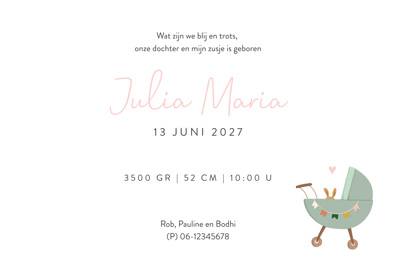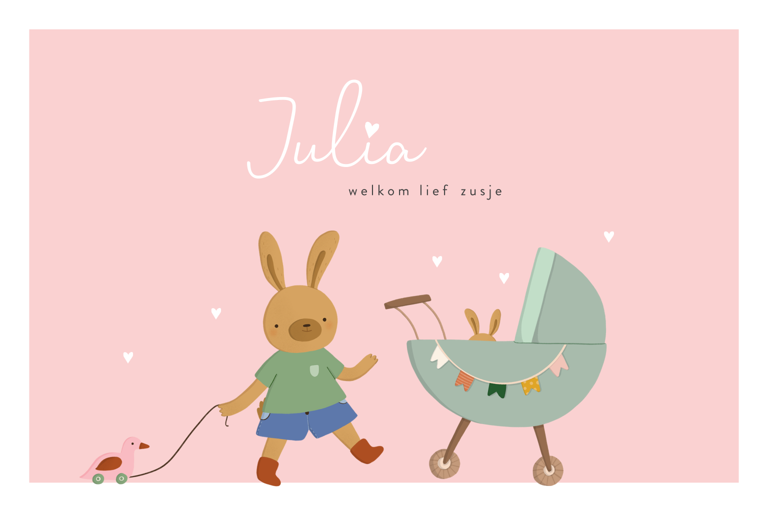 Een tweede kindje, wat geweldig! Kondig dit blijde nieuws aan met dit lieve geboortekaartje met twee getekende konijntjes. Het oudere broertje duwt de kinderwagen met daarin zijn baby zusje vooruit. Een vrolijk en lieflijk ontwerp, vind je ook niet? Bestel een eerste proefdruk om te kunnen zien hoe dit geboortekaartje er gedrukt uit komt te zien.