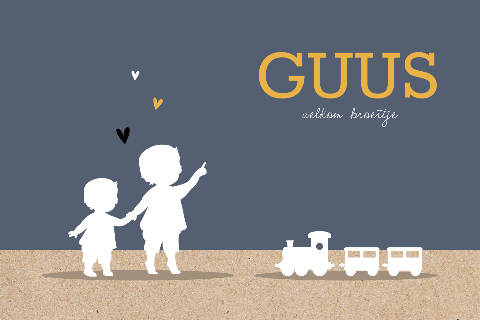 Strak geboortekaartje met donkerblauwe achtergrond en strook kraft look. Op de voorzijde zie je een silhouet van twee broertjes. Pas de kaart compleet naar wens aan door de kleuren aan te passen en de lettertypes te veranderen. In de kaart is ruimte voor een gedichtje en natuurlijk de naam en de geboortegegevens.