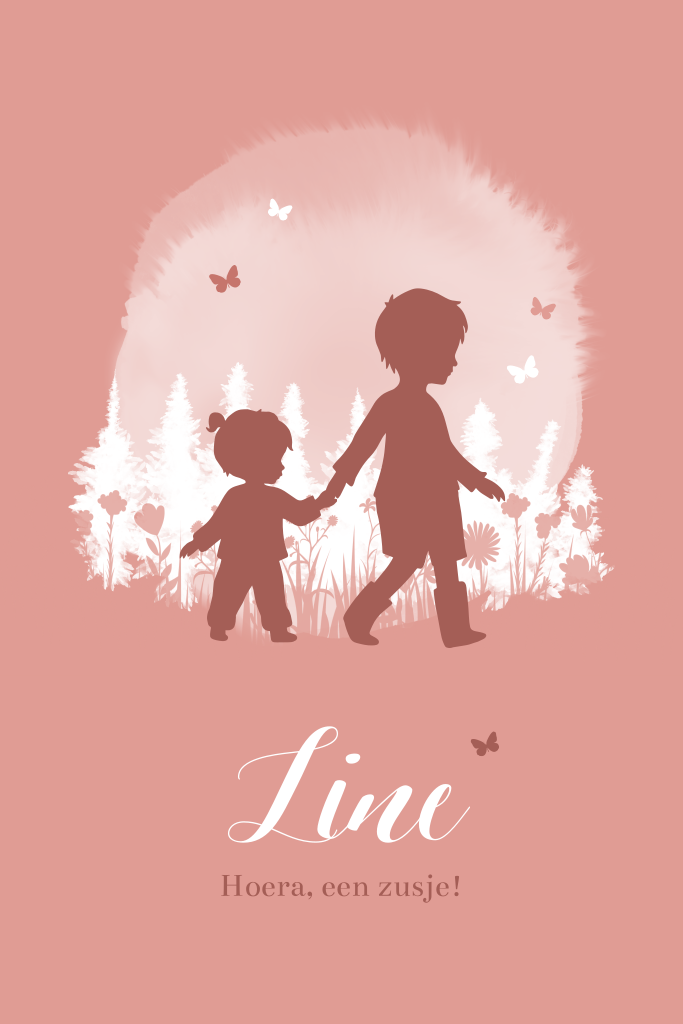 Lief geboortekaartje voor een klein zusje met silhouetjes en waterverf achtergrond. Geef grote broer een plekje op het geboortekaartje met dit roze silhouet geboortekaartje. Broer en zusje lopen door een veld met bloemen en vlindertjes. Pas deze kaart zelf aan in onze editor.