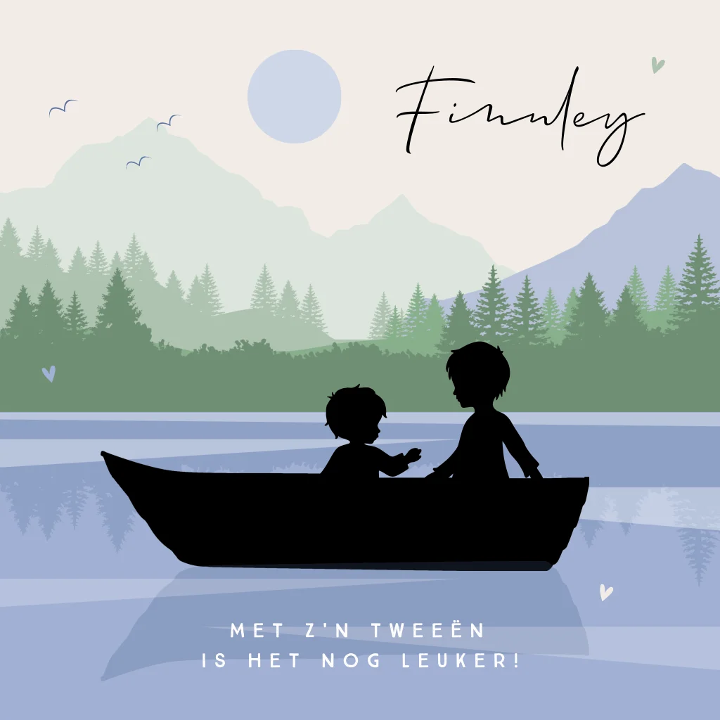 Is er een klein broertje op komst? Ga voor dit silhouet geboortekaartje met twee broertjes in een bootje. De twee kindjes varen in een roeibootje over een meer tussen de bergen en bomen. De kleuren kun je zelf wijzigen in onze handige editor.