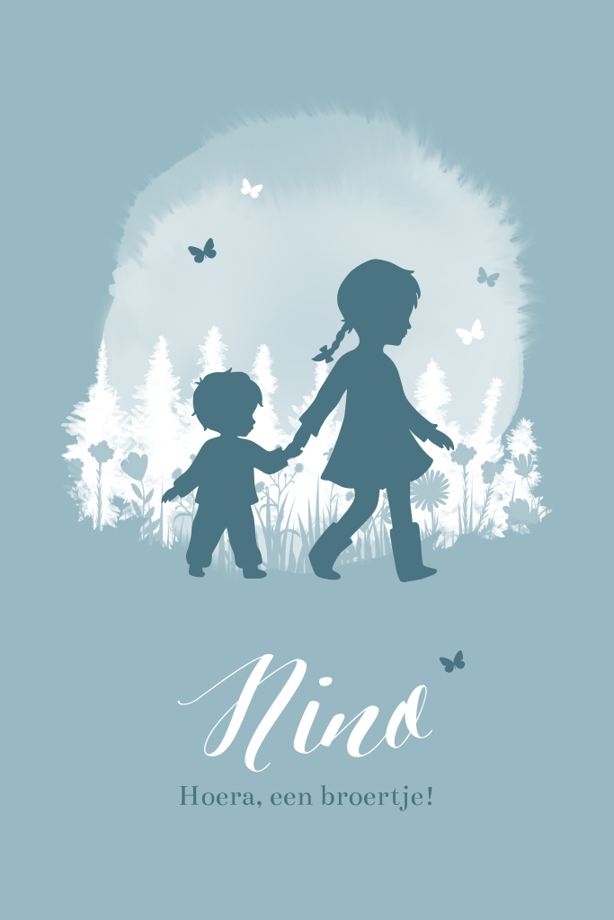 Lief geboortekaartje voor een klein broertje met silhouetjes en waterverf achtergrond. Geef grote zus een plekje op het geboortekaartje met dit blauwe silhouet geboortekaartje. Zus en broertje lopen door een veld met bloemen en vlindertjes. Pas deze kaart zelf aan in onze editor.