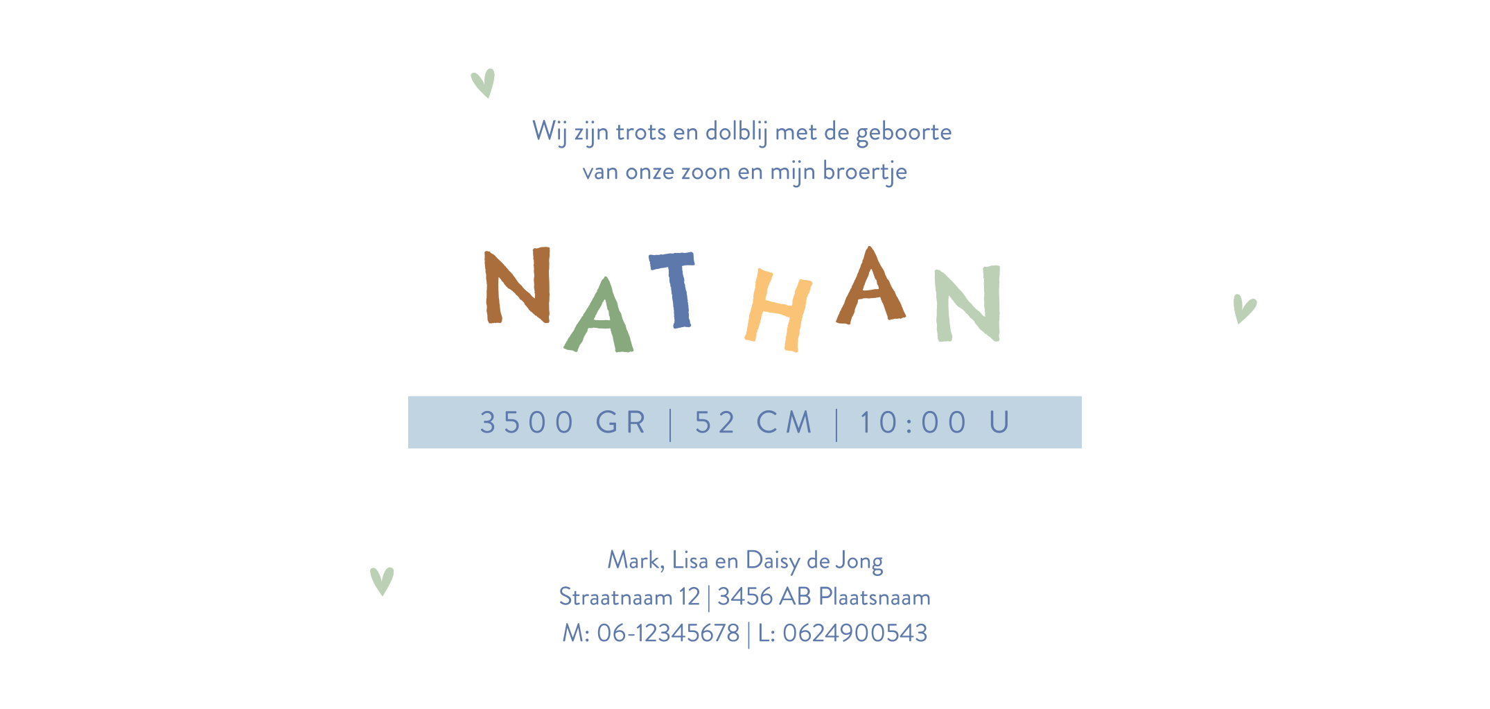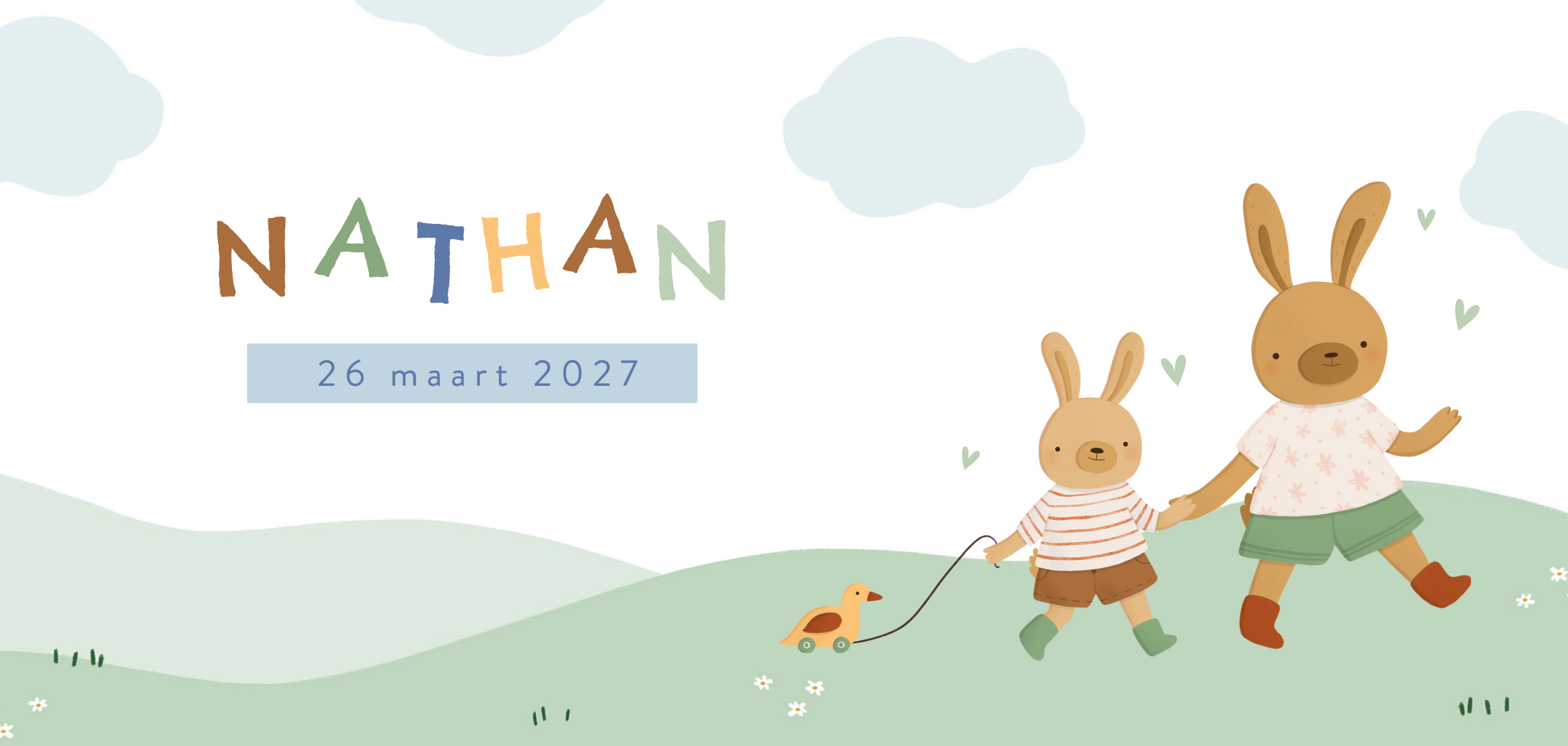 Is er een klein broertje op komst? Gefeliciteerd! Geef hem en zijn grote zus een plekje op het geboortekaartje met dit lieve illustratieve ontwerp met twee huppelende konijntjes. De grote zus en haar broertje wandelen door een kleurrijk landschap met een speelgoed eendje. De speelse typografie, hartjes en blauwe wolkjes maken het geheel helemaal af.