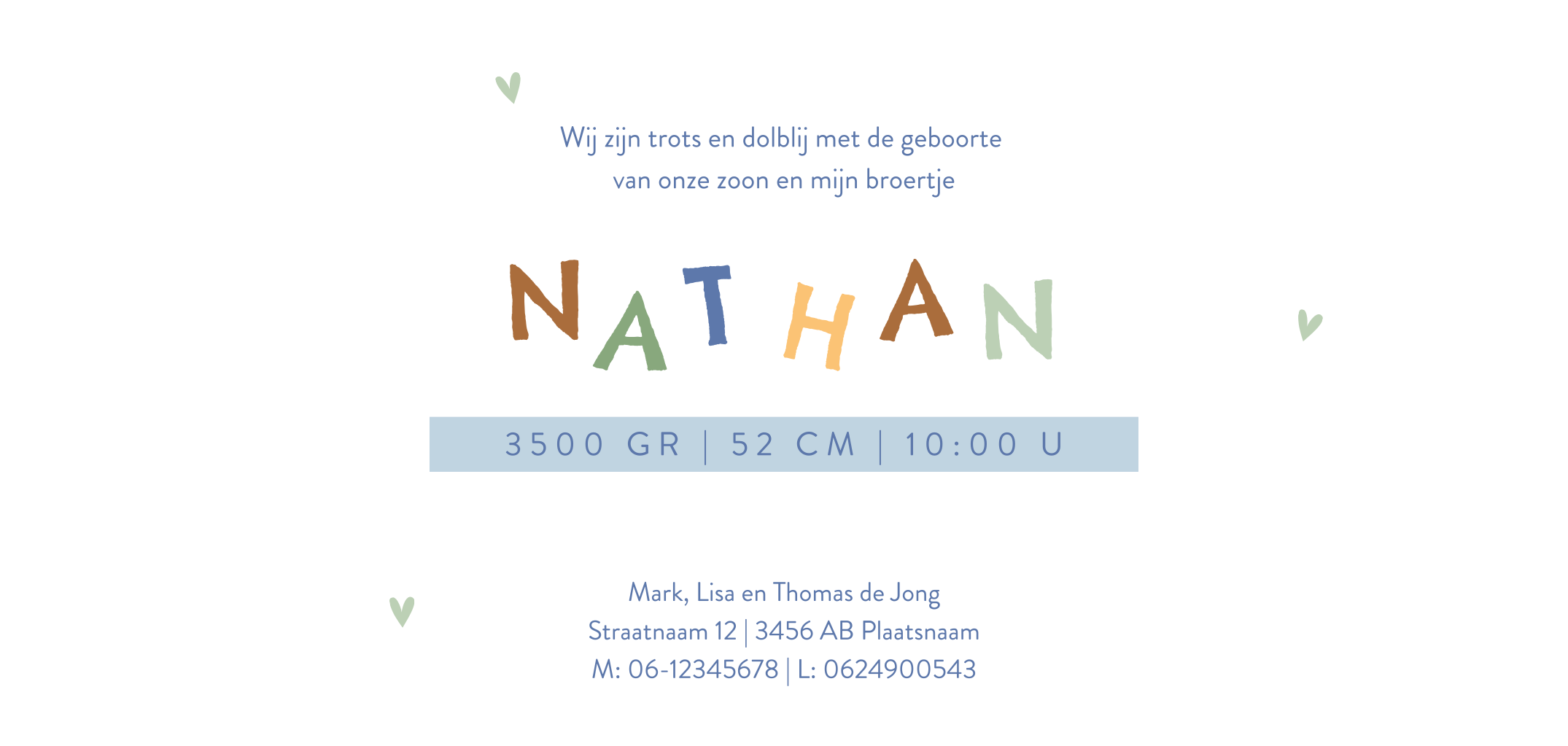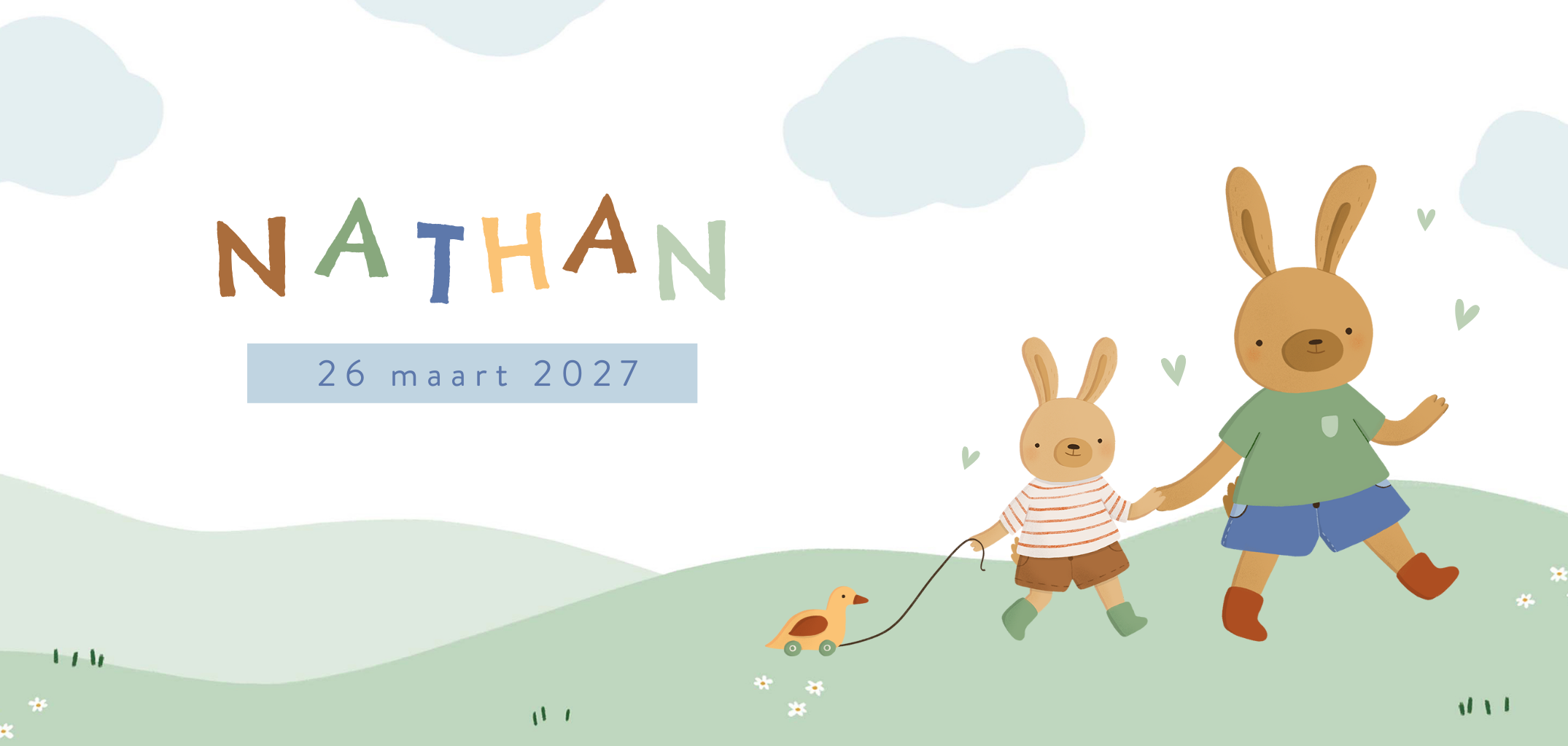 Een lief geboortekaartje met geïllustreerde konijnen broertjes in een vrolijk landschap. De twee broertjes wandelen hand in hand door het groene gras met hun speelgoed eendje. De naam van je zoontje komt in kleurrijke en speelse letters voorop. Kondig de geboorte van je tweede zoon aan met dit leuke ontwerp.