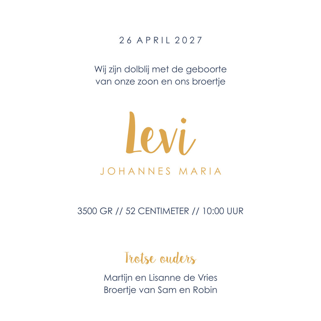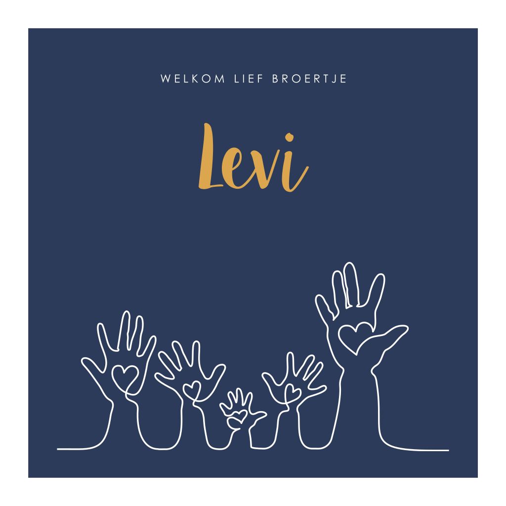 Hoera, er is er een derde kindje op komst en dit keer een jongen! Kies dan voor dit lieve geboortekaartje met vijf handen erop, voor ieder gezinslid één hand. De tekening is in één lijn getekend en in de handen zit ook nog een lief hartje. Zo horen jullie als gezin allemaal bij elkaar. Aan de binnenzijde zie je een illustratie van de pasgeboren baby, ook in één lijn getekend. Pas zelf dit toepasselijke geboortekaartje aan.
