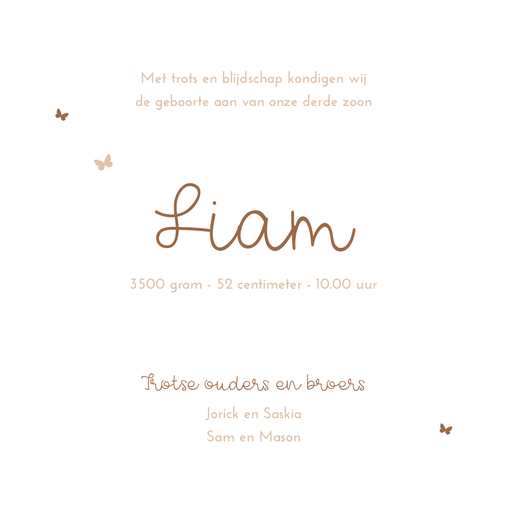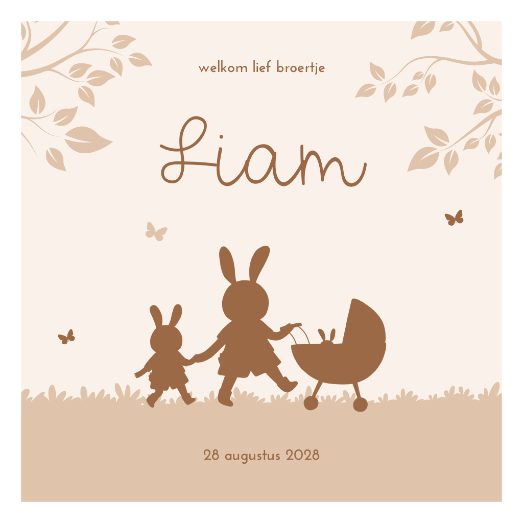 Wordt er binnenkort een derde kindje geboren? Hoe leuk is dat! Kondig zijn komst aan met dit vrolijke geboortekaartje met drie konijntjes in silhouet. In een kinderwagen zit een klein baby konijntje. Zijn grote zusjes of broertjes duwen de kinderwagen door het gras met kleine vlindertjes die eromheen vliegen. Aan de binnenzijde kun je alle geboortegegevens van je derde kind plaatsen. Pas dit design zelf aan in onze editor.