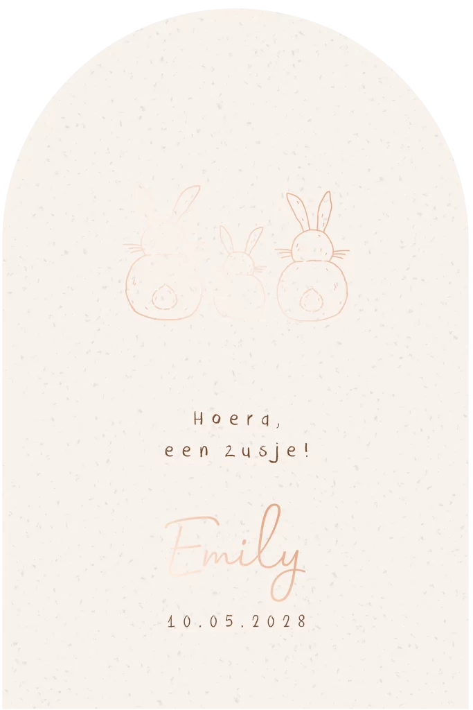 Vier de geboorte van jullie derde kindje met dit bijzondere geboortekaartje. Drie schattige konijntjes staan centraal, symbool voor jullie gezin. De warme ecru tint en roségoudfolie zorgen voor een stijlvolle uitstraling, terwijl de afgeronde bovenzijde door de stans het kaartje een uniek en origineel karakter geeft.