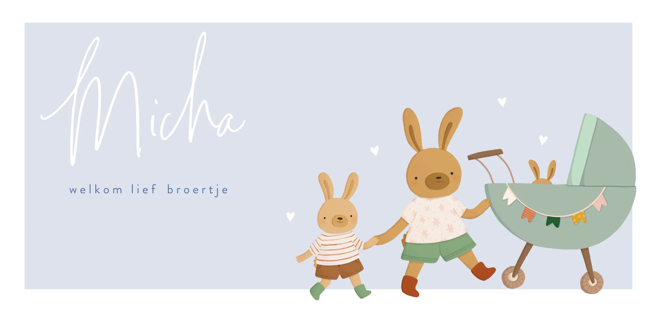 Ben je fan van dieren illustraties? Misschien is dit lieve ontwerp met drie getekende konijntjes dan iets voor jou. Je andere kinderen krijgen op dit kaartje een prominente plek als schattige konijntjes die een kinderwagen duwen. Uit de kinderwagen steken twee nieuwsgierige oortjes. Wijkt jullie gezinssamenstelling af? Wijzig deze dan in onze handige designtool (bij "Afbeeldingen en versieringen" en dan onderaan bij "dieren").
