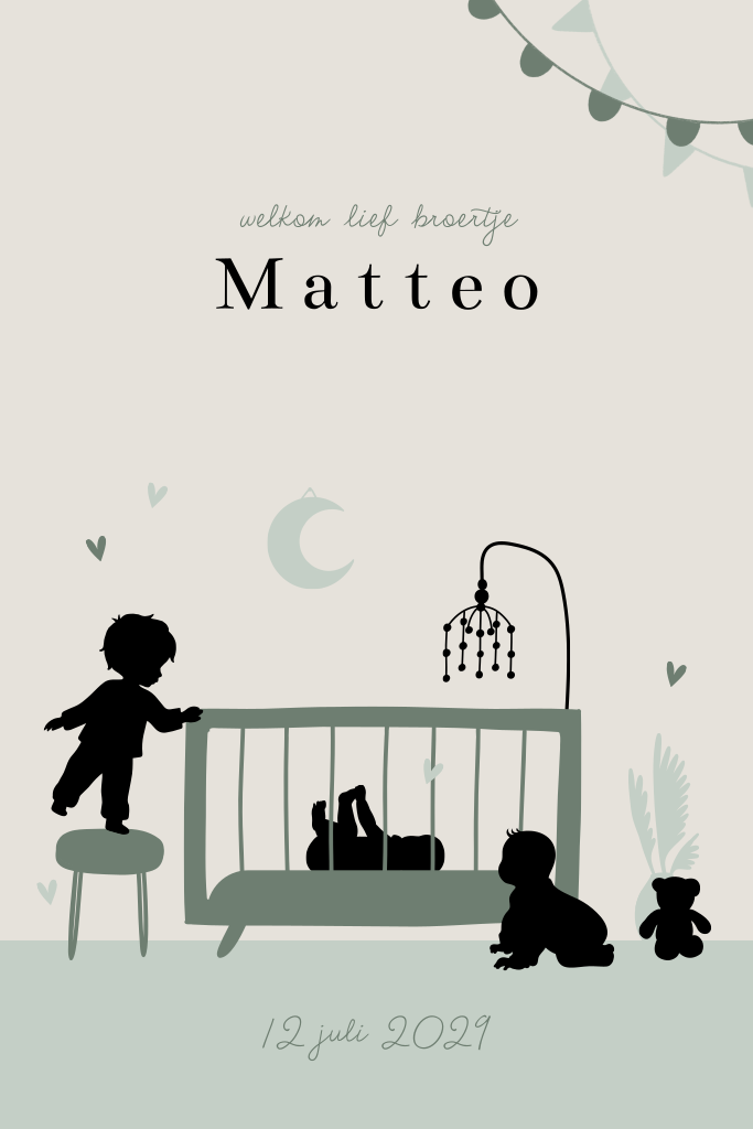 Wordt jullie gezin binnenkort uitgebreid met een kleine broer? Hoe geweldig! Breng de aankondiging van de komst van jullie derde kindje over met dit vertederende silhouet geboortekaartje. Hier zie je een grote broer die nieuwsgierig in het wiegje van zijn pasgeboren broertje gluurt, terwijl zijn kleine zusje tussen de spijlen door kijkt. De feestelijke slingers en schattige hartjes voegen een vrolijke touch toe aan dit kaartje. Je kunt eenvoudig de kleuren en lettertypes aanpassen naar jouw voorkeur met behulp van onze handige editor. Bij 'Silhouet familie' kun je de broertjes / zusjes aanpassen naar jouw gezinssamenstelling.