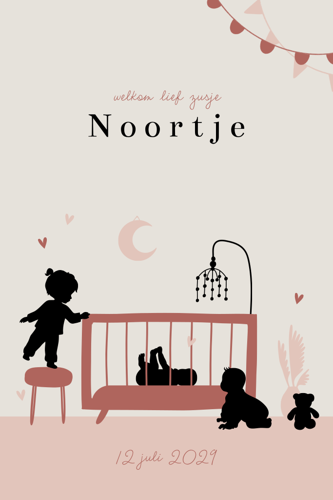 Gaat jullie gezin binnenkort uitbreiden met een lief zusje? Wat een vreugde! Verwelkom haar aankomst met dit teder silhouet geboortekaartje. Hier zie je een grote zus die vol verwondering in het wiegje van haar pasgeboren zusje gluurt, terwijl haar jongere broertje naast haar door de spijlen toekijkt. De speelse slingers en vrolijke hartjes geven dit kaartje een feestelijke uitstraling. Je kunt gemakkelijk de kleuren en lettertypes naar wens aanpassen met behulp van onze gebruiksvriendelijke editor. Bij 'Silhouet familie' kun je de broertjes / zusjes aanpassen naar jouw gezinssamenstelling.