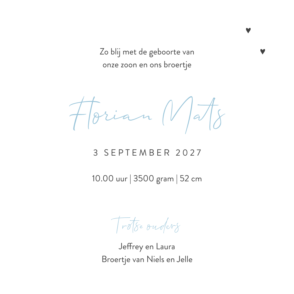 Zachtblauw silhouet geboortekaartje voor je derde kindje! Op het kaartje staat een wip met daarop de twee oudste kinderen en hun baby broertje. Verander de achtergrond of silhouetjes gemakkelijk van kleur in onze ontwerptool of pas de lettertypes aan.