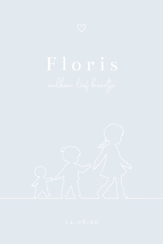 Een liefdevol en tijdloos geboortekaartje ter aankondiging van de geboorte van een derde kindje. Het kaartje toont een verfijnde lijntekening van drie kindjes die in een rijtje lopen, prachtig geaccentueerd met zilverfolie. Wil je graag een andere tint folie of wellicht een andere kleur achtergrond? Laat jouw eigen creativiteit de vrije loop en personaliseer dit geboortekaartje met gemak via onze handige ontwerptool.
