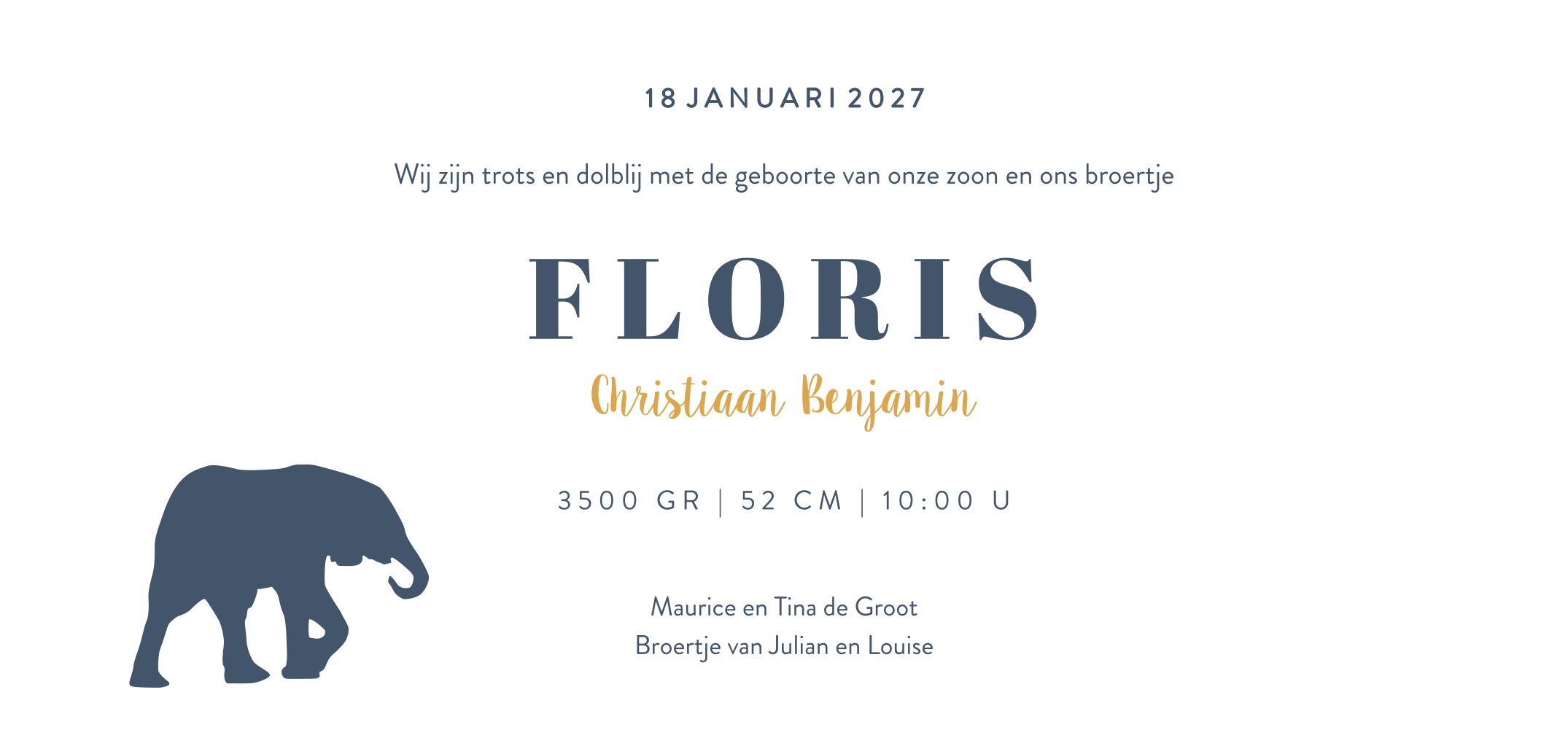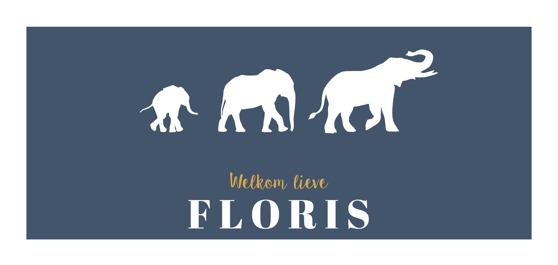 Op het kaartje zijn drie olifantjes te zien, deze staan symbool voor jullie kinderen. De achtergrondkleur is donkerblauw met een witte lijst eromheen. Het kaartje heeft een hele lieve maar toch moderne uitstraling. In de kaart is plaats voor de geboortegegevens, de datum en een lief gedichtje. Pas de kaart zelf eenvoudig aan in de ontwerptool.