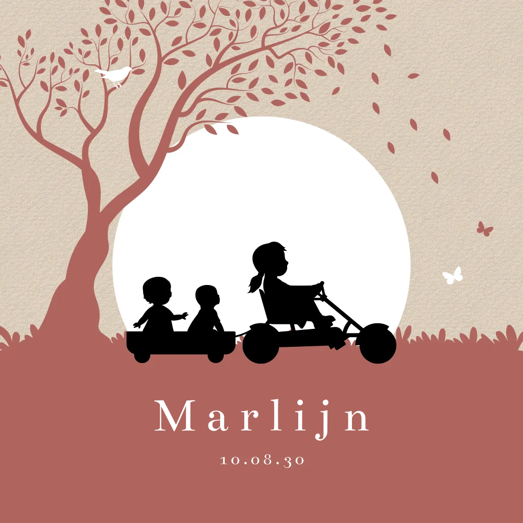 Geboortekaartje voor een derde kindje met een silhouet van een ouder zusje op een karretje, met daarachter twee jongere kindjes. Het tafereel onder de boom met vallende blaadjes, een vogeltje en vlinders geeft het kaartje een speels geheel. De naam komt mooi naar voren in goudfolie op de warme achtergrond.