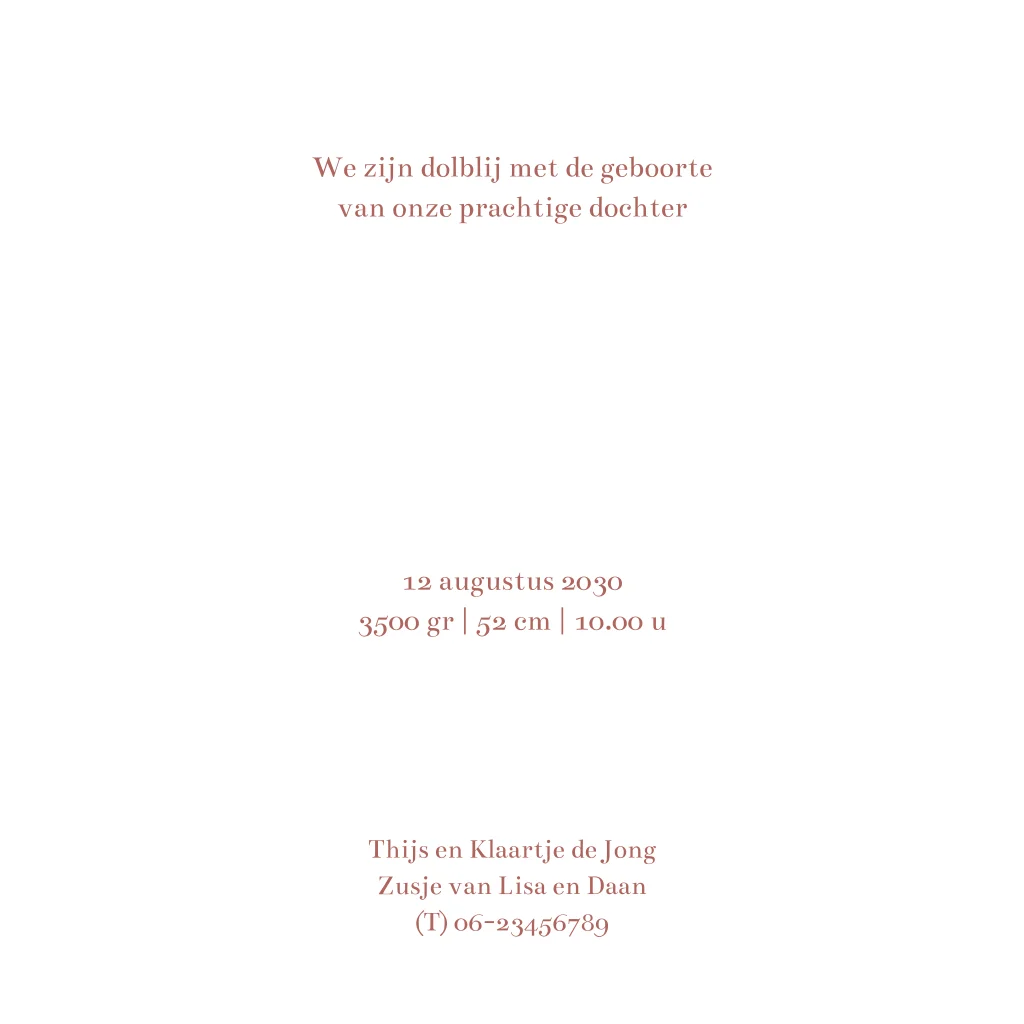 De illustratie is eenvoudig aan te passen in de editor, zodat je de samenstelling van de kindjes kunt wijzigen naar wat past bij jullie gezin. Geschikt voor de geboorte van een meisje. Personaliseer het kaartje en bestel een proefdruk.