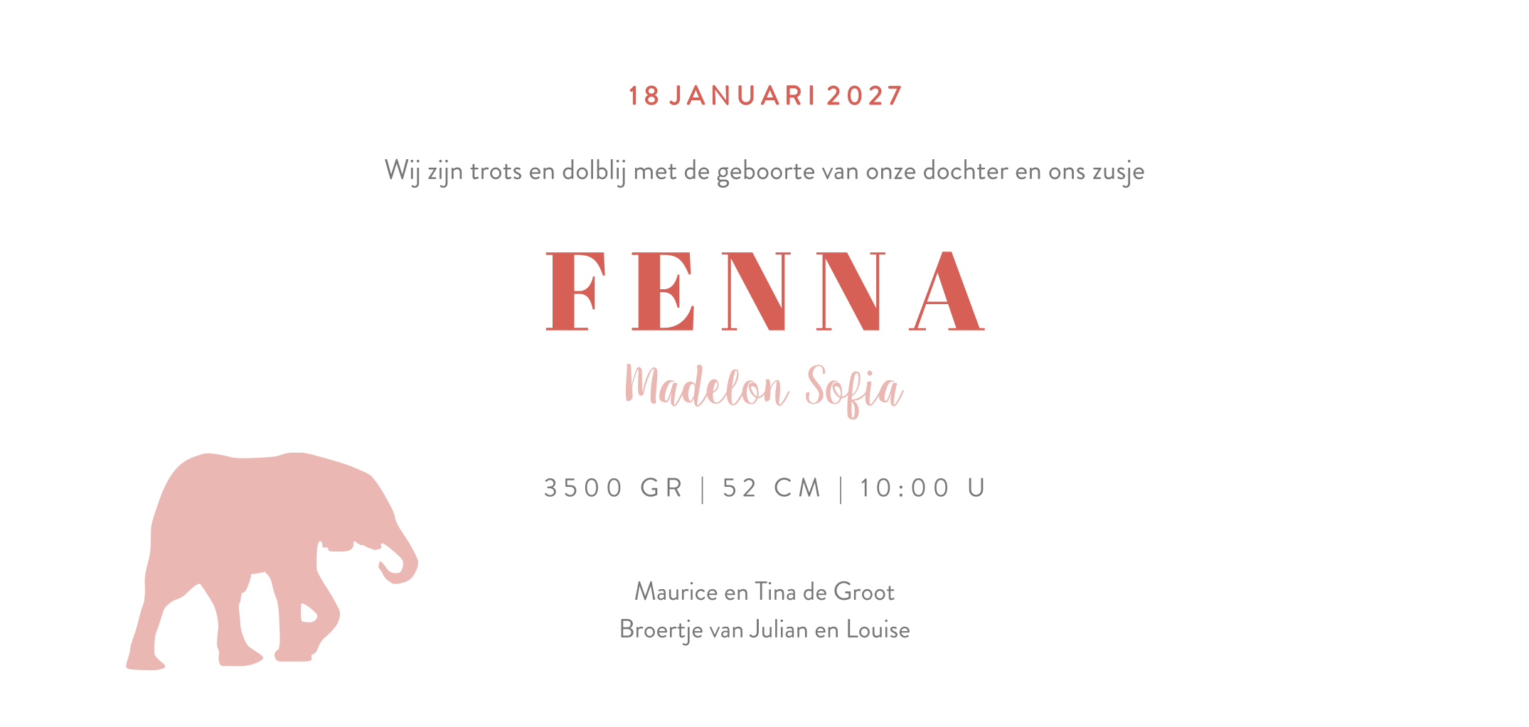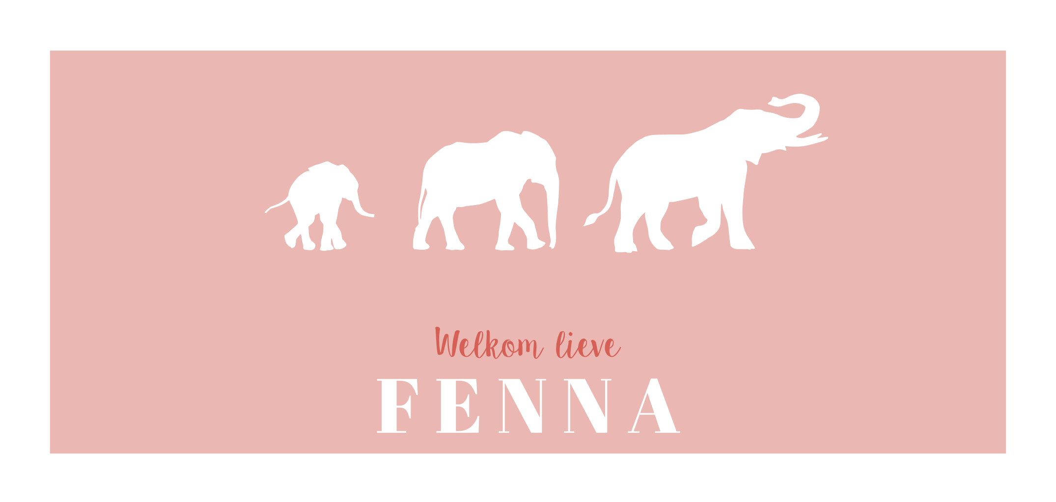Dit geboortekaartje is lief en modern tegelijk. Op het kaartje is te zien hoe de drie olifantjes achter elkaar aan lopen. De achtergond is roze en er zit een witte lijst omheen. Pas de kleuren, typografie en teksten aan om een heel nieuw en uniek geboortekaartje te maken, bestel vervolgens een proefdruk om het resultaat in het echt te bekijken.
