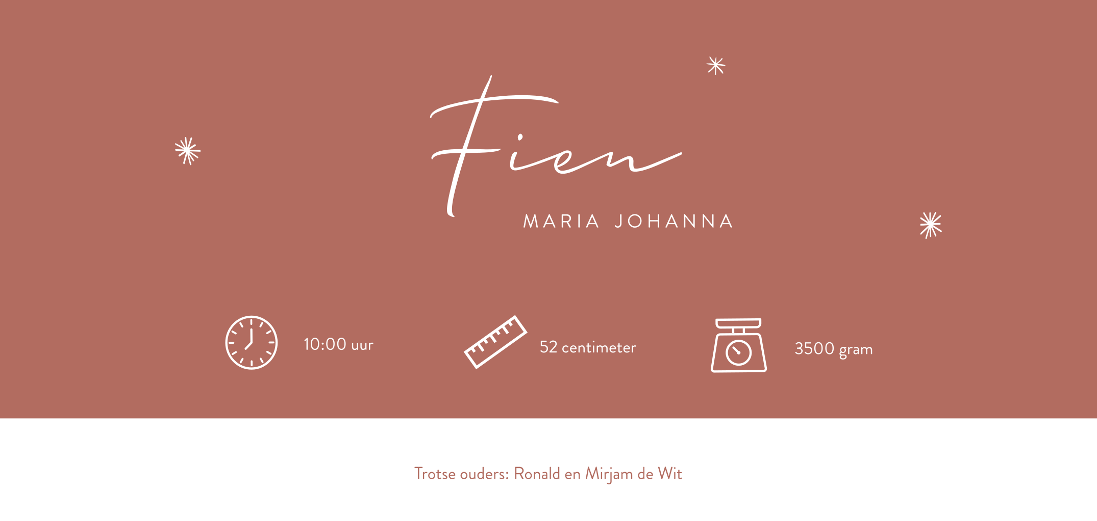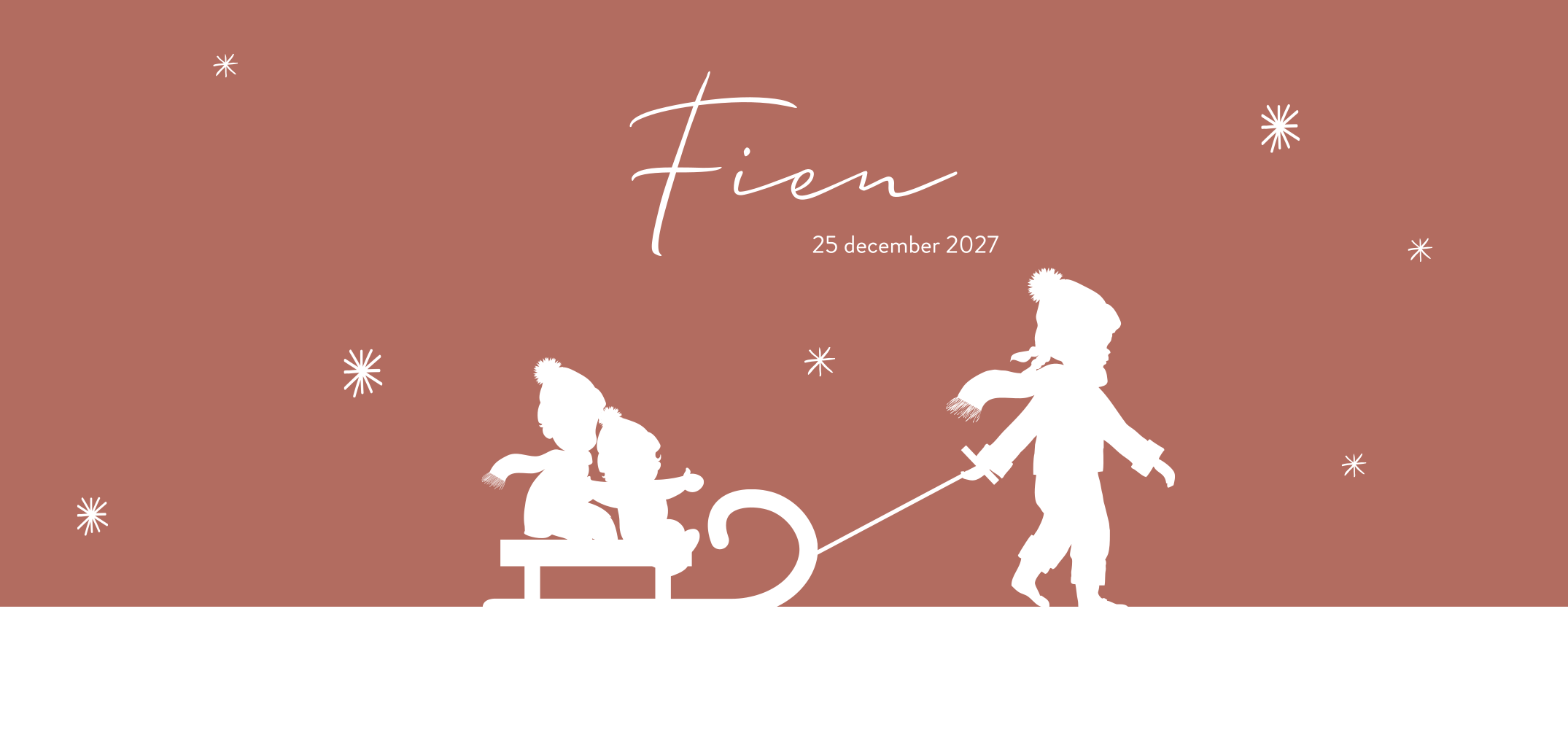 Verwacht je jouw derde kindje deze winter? Daar hoort natuurlijk een mooie kaart bij. Op de voorzijde zie een grote zus en een broertje met hun baby zusje op de slee. De silhouetjes kun je vervangen met de designtool mocht de samenstelling niet kloppen, kijk bij "silhouet familie" voor de broertjes/zusjes. De naam krijgt extra glans door de goudfolie. Pas de kaart naar wens aan en bestel een drukproef.