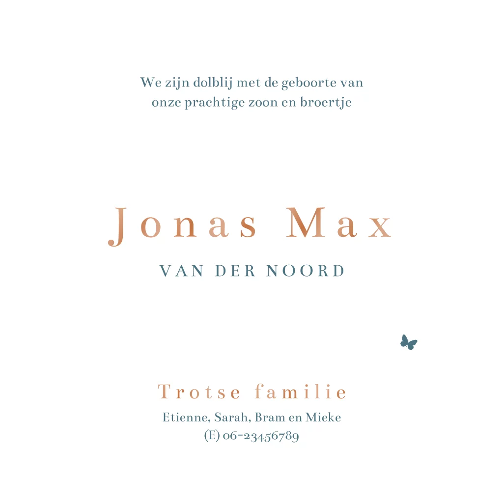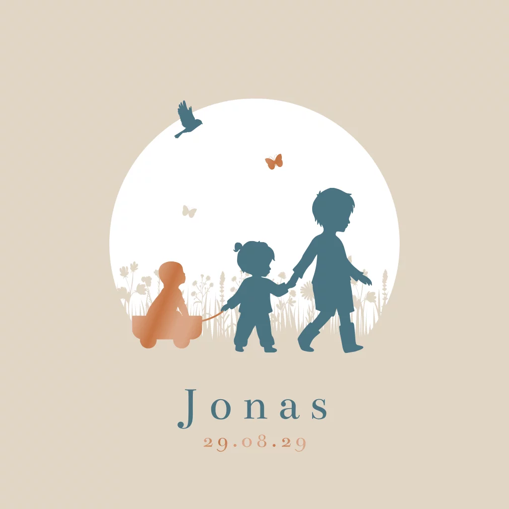 Prachtig beige geboortekaartje om de geboorte van jullie derde kindje aan te kondigen. De oudste twee kindjes lopen voorop, hand in hand. In de kar zit hun baby broertje. De baby silhouet en de geboortedatum worden in roestbruin hoogglans gedrukt. Aan de binnenkant kun je alle tekst kwijt. Personaliseer dit geboortekaartje met silhouetjes eenvoudig in onze editor en bestel een proefdruk.