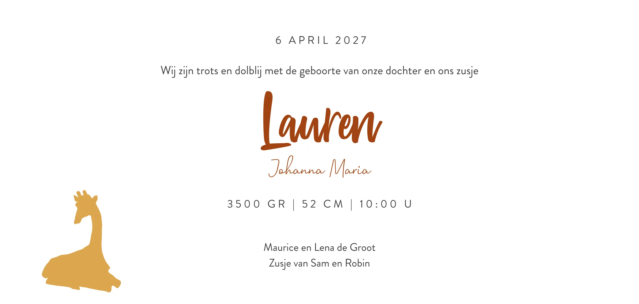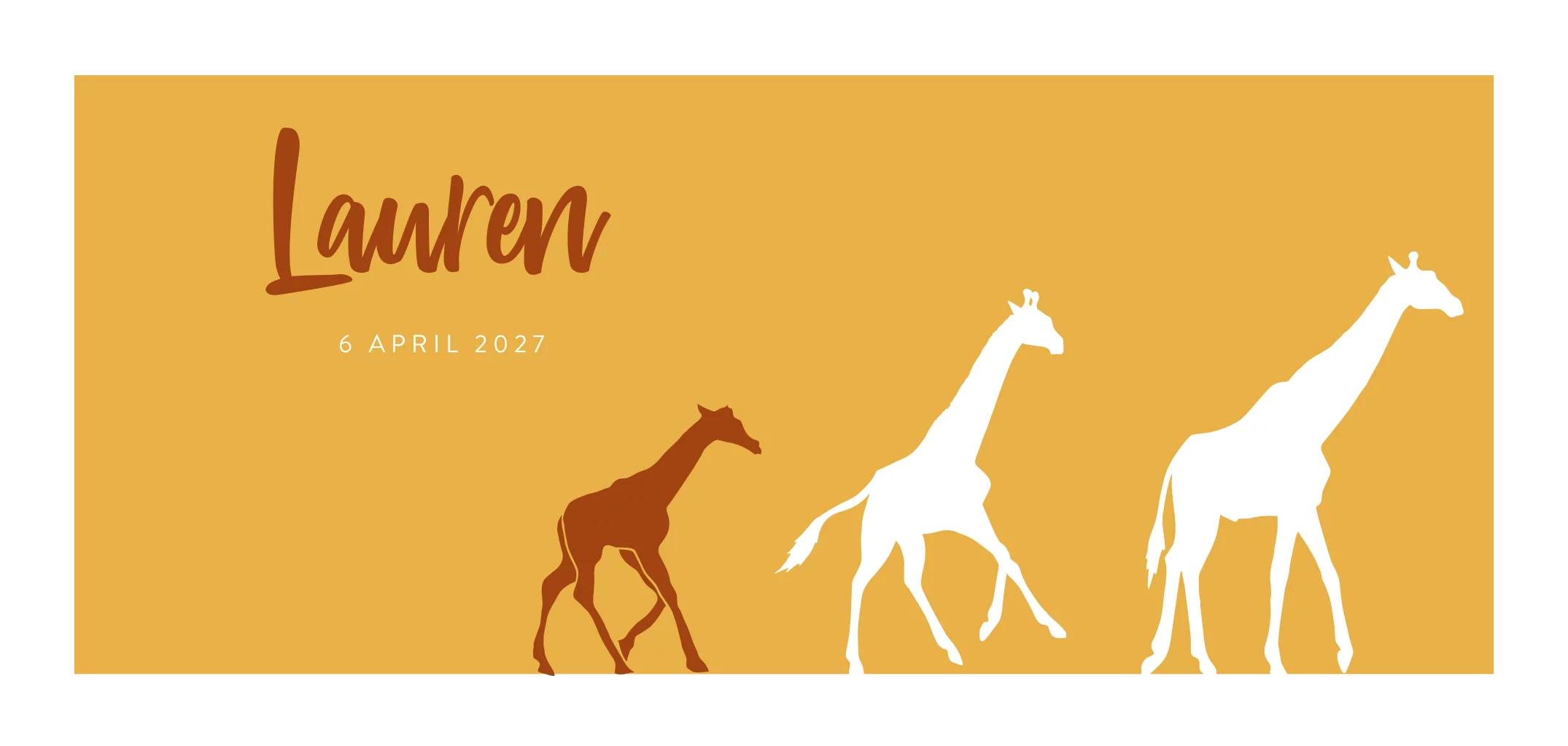 Trendy geboortekaartje met okergele achtergrond, wit kader en een rij met drie girafjes van groot naar klein. De kleinste giraf, staat symbool voor jullie jongste dochter in een roestrode kleur. En nu dit jullie 3e kindje is, past dit helemaal bij jullie gezin! De andere twee giraffen, geven jullie oudste kinderen weer. Pas de kaart zelf heel simpel aan in de designtool. Deze silhouetten vind je terug in onze tool bij "Afbeeldingen en versieringen" in de map "Silhouet dieren".