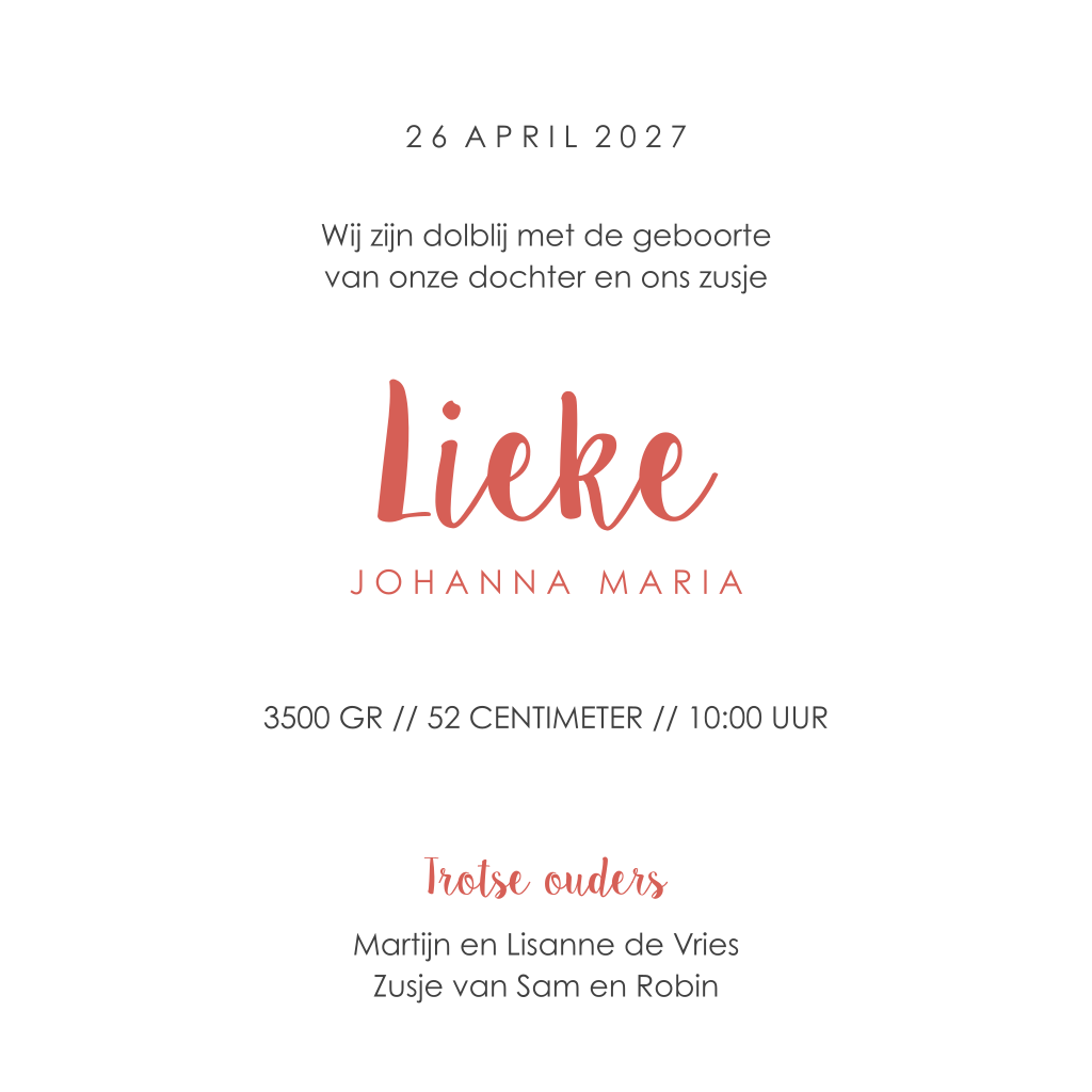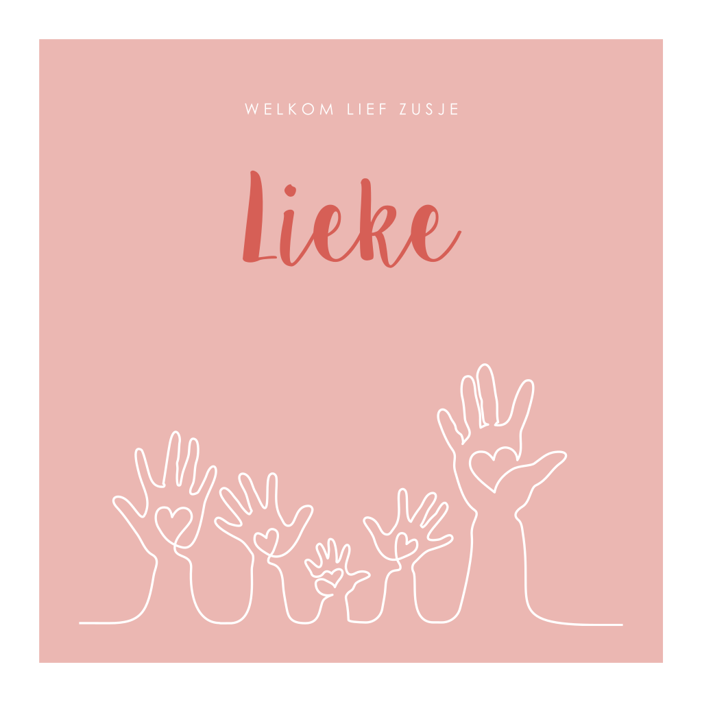 Ben je in verwachting van je derde kindje en dit keer een dochter? Hoe leuk is dan dit geboortekaartje? Met vijf getekende handen erop voor alle gezinsleden. Dit kaartje is extra lief door de roze achtergrond. De illustratie is met één lijn getekend en in de handen zit ook nog een lief hartje. Aan de binnenzijde zie je een gedichtje dat over je pasgeboren dochtertje gaat. Pas zelf dit originele geboortekaartje aan in onze handige ontwerptool.