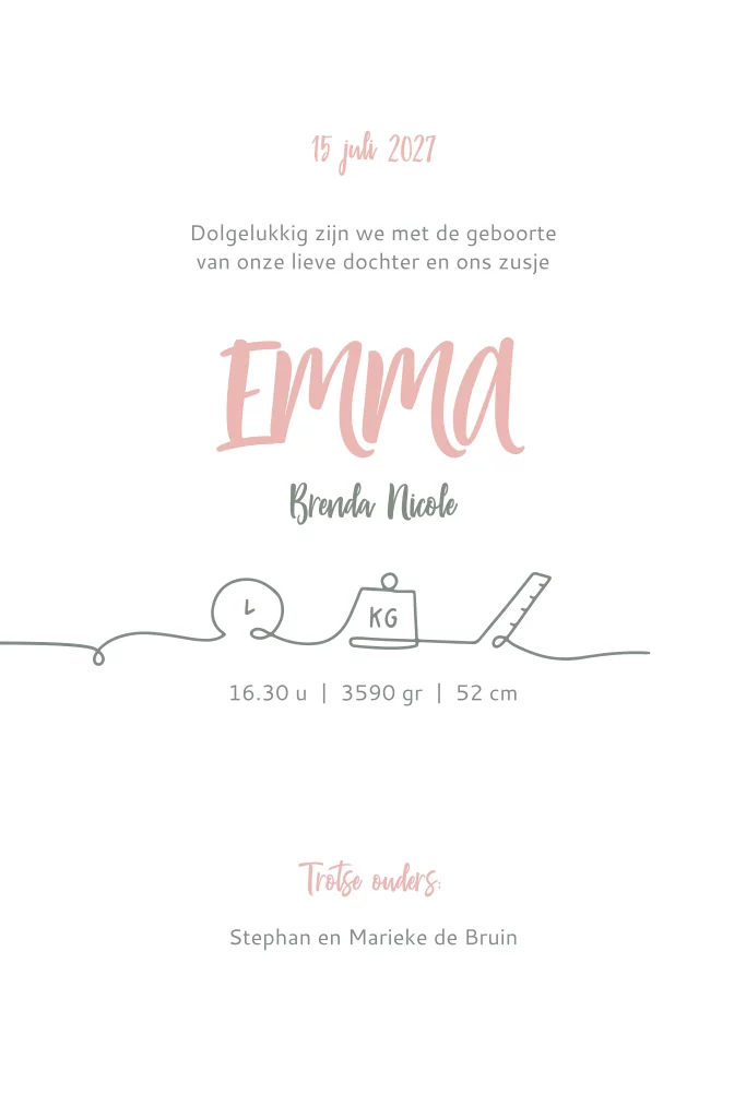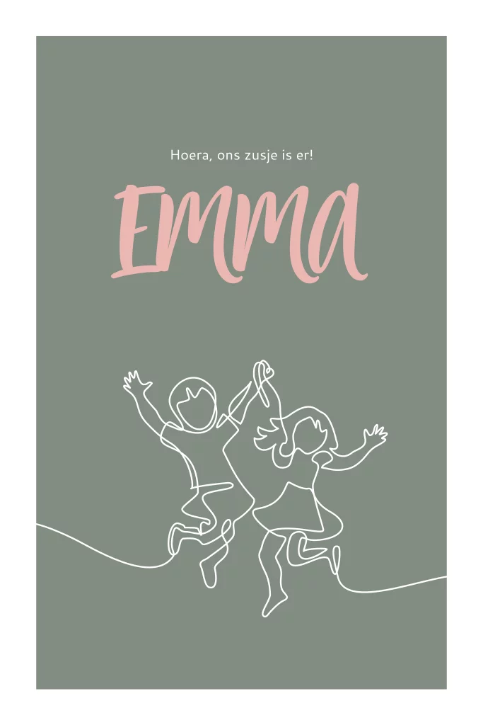 Staat iedereen in jullie gezin te springen op de komst van een 3e kindje? Hoe leuk is dan een geboortekaartje te kiezen met voorop de twee oudste superblije zusjes die hoog in de lucht springen van blijdschap. Dan kunnen ze later mooi met z'n drieën stoeien en spelen. Je kan lijntekening van de twee meisjes vervangen in de ontwerptool passend bij jullie gezinssamenstelling. De illustraties vind je terug bij "Afbeeldingen en versieringen" en dan "oneline". Bestel een drukproef van dit supervrolijke geboortekaartje voor een 3e kindje.
