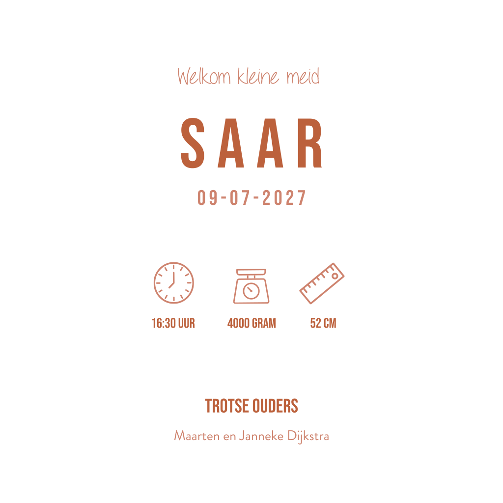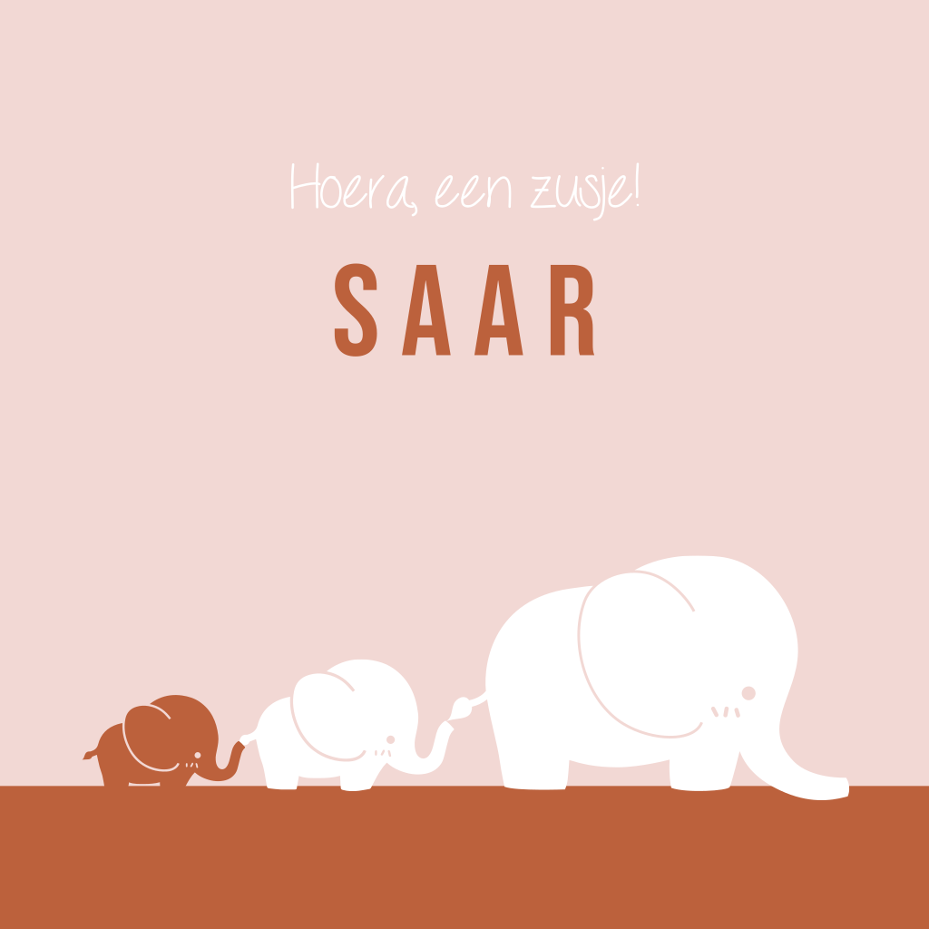 Is er opnieuw een meisje op komst? Geef dan haar oudere broertjes/zusjes een leuk plekje op het geboortekaartje. Zoals bij dit ontwerp met drie olifantjes. De kleinste olifant houdt de staart van de grotere olifant vast. In onze editor kan je dit ontwerp geheel naar wens personaliseren. Heb je hier hulp bij nodig? Neem dan contact op met onze klantenservice.