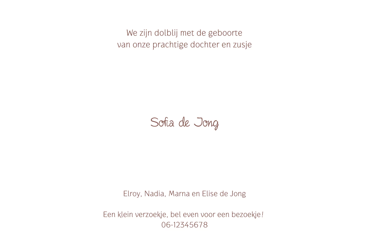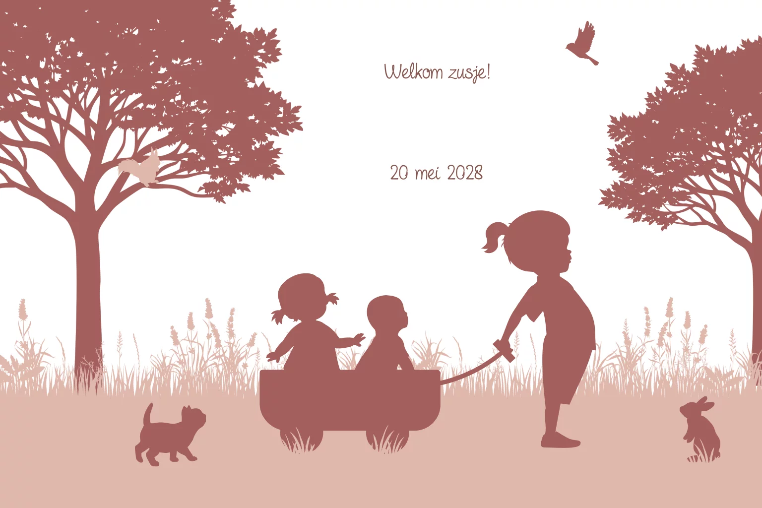 Wat een mijlpaal! Dit roze/rode silhouet geboortekaartje zie je de oudste dochter die een karretje trekt met daarin haar zusje en de baby. Extra bijzonder zijn de naam en vlindertjes op de kaart – die schitteren in roségoudfolie. Je kunt de silhouetjes makkelijk aanpassen in de editor, zodat het helemaal klopt met jullie gezin. Maak 'm helemaal eigen en bestel een proefdruk om 'm in het echt te zien.