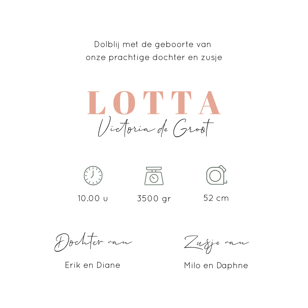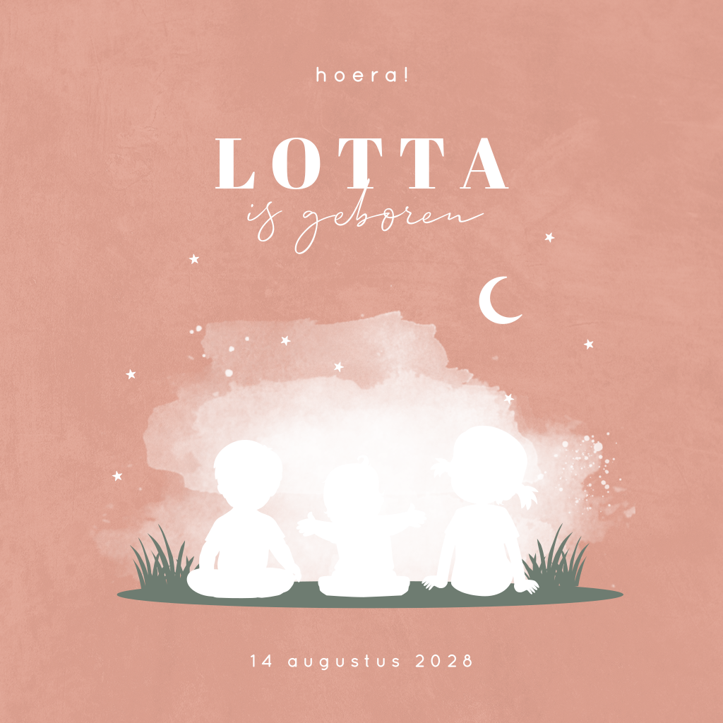 Een mooi geboortekaartje voor een derde kindje in roze kleur met hoogglans zwarte silhouetjes. Pas zelf de silhouetjes aan in onze ontwerptool, kijk in de afbeeldingenmap 'Silhouet familie' voor tientallen broertjes en zusjes. Aan de binnenzijde is ruimte voor een kort gedichtje of lieve quote en alle geboortegegevens van de kleine.