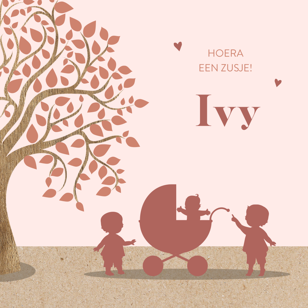 Silhouet geboortekaartje boom en broertjes met baby zusje