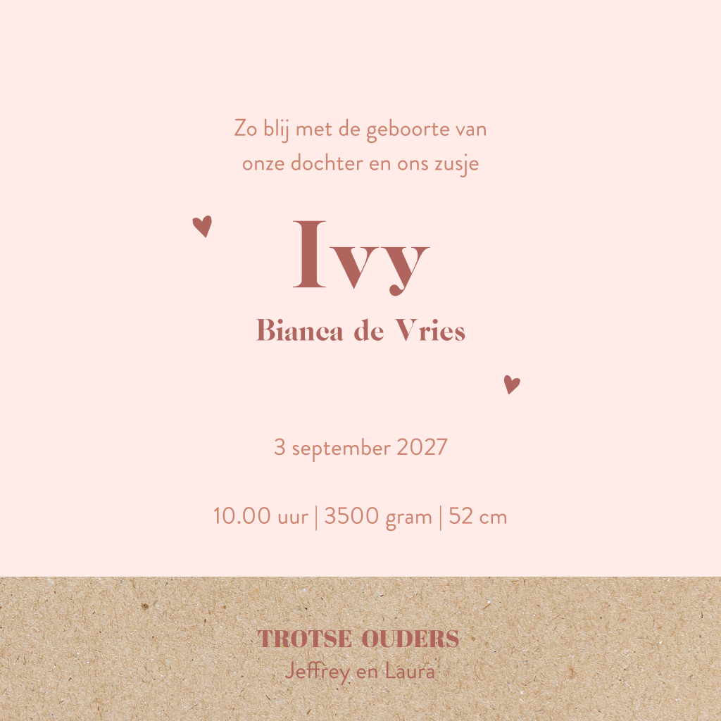 Op zoek naar een uniek geboortekaartje voor je dochter en wil je graag je oudste kinderen ook een plekje geven op de kaart? Dat gemakkelijk met dit silhouet geboortekaartje. De silhouetjes vind je terug onder het mapje "silhouet familie" op deze manier kan je de kindjes aanpassen naar de samenstelling die bij jullie past. Je kan de achtergrond, blaadjes aan de boom, de kinderen en de teksten wijzigen. Voor je het weet heb je een uniek kaartje in handen.