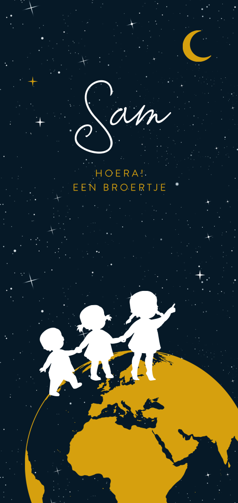 Ben je in verwachting van een derde kind? Dan is dit geboortekaartje met drie kinderen perfect passend bij jullie gezin. De oudste twee zusjes staan hand in hand met hun baby broertje in wit silhouet op een donkerblauwe sterren achtergrond. De oudste zus wijst naar de maan. Andere gezinssamenstelling? De kindjes vind je in de designtool bij "Afbeeldingen en versieringen" en dan "silhouet familie". Pas de kaart naar wens aan en bestel een drukproef.