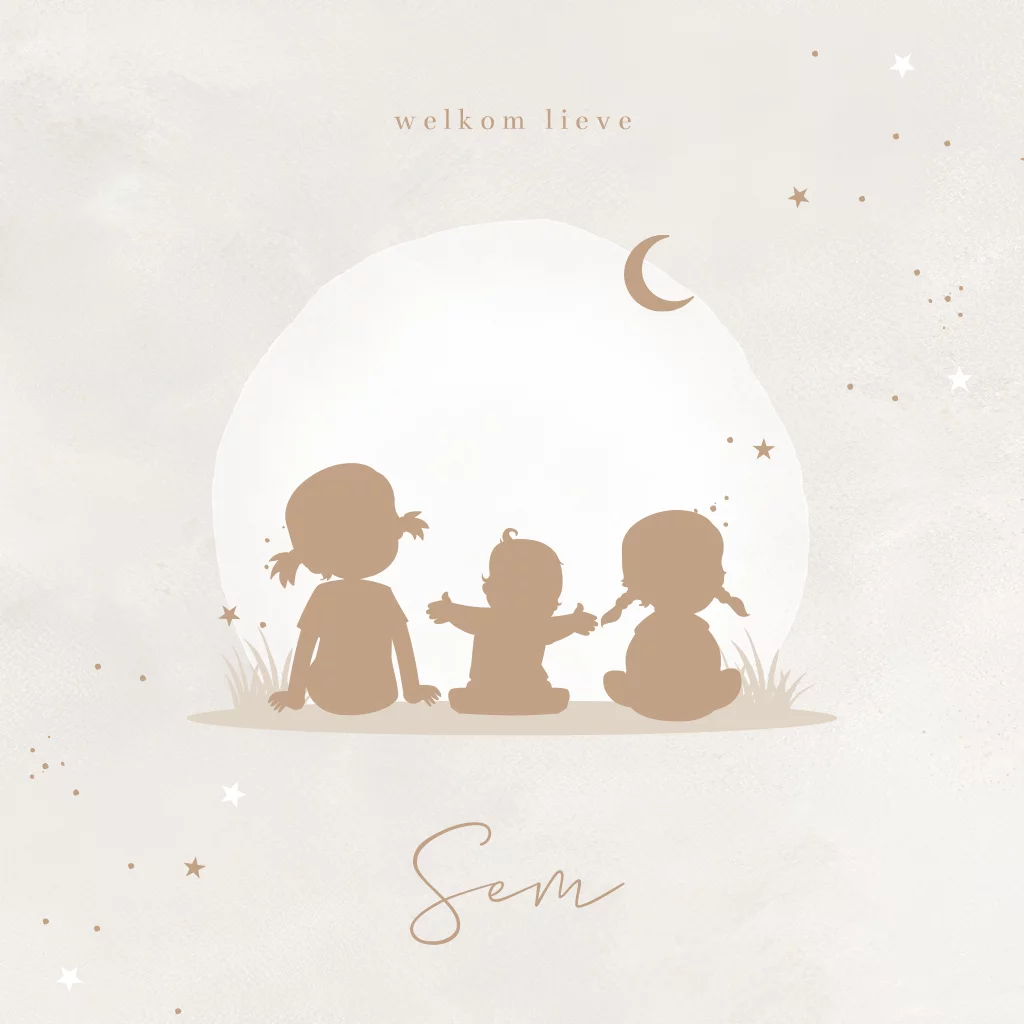 Silhouet geboortekaartje met een liefdevol beeld van twee zusjes zittend met hun nieuwe broertje of zusje onder een maan en sterrenhemel. De warme tinten en het rustige ontwerp maken het een mooie keuze voor een derde kindje. Het kaartje kan eenvoudig worden aangepast met een ontwerptool, zodat namen, kleuren en teksten naar wens kunnen worden ingevuld. Perfect voor ouders die een stijlvol en persoonlijk geboortekaartje zoeken.