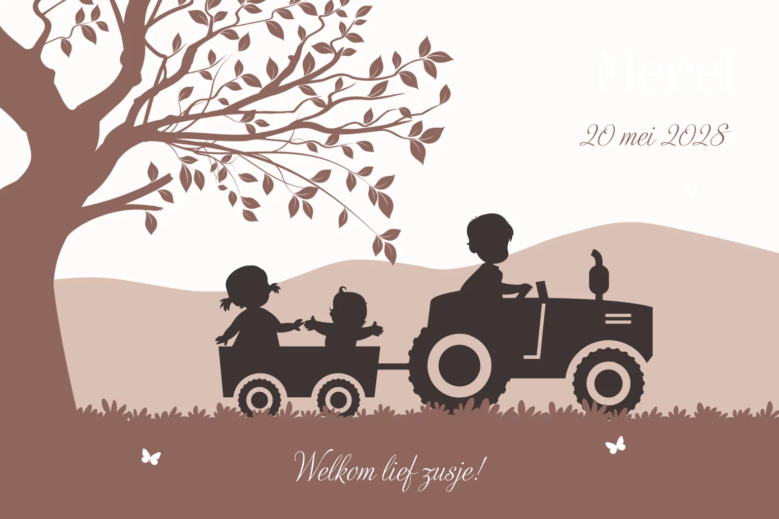 Geboortekaartje voor een derde kindje, een meisje, in warme roestbruine tinten. Op het ontwerp zie je een silhouet van een tractor, bestuurd door de oudste zoon. Achter de tractor hangt een kar met daarin zijn kleine zusje en de pasgeboren kleine meid. De naam van de baby en kleine vlindertjes zijn in roségoudfolie gedrukt. Je kunt de kindjes heel simpel wijzigen in de editor.
