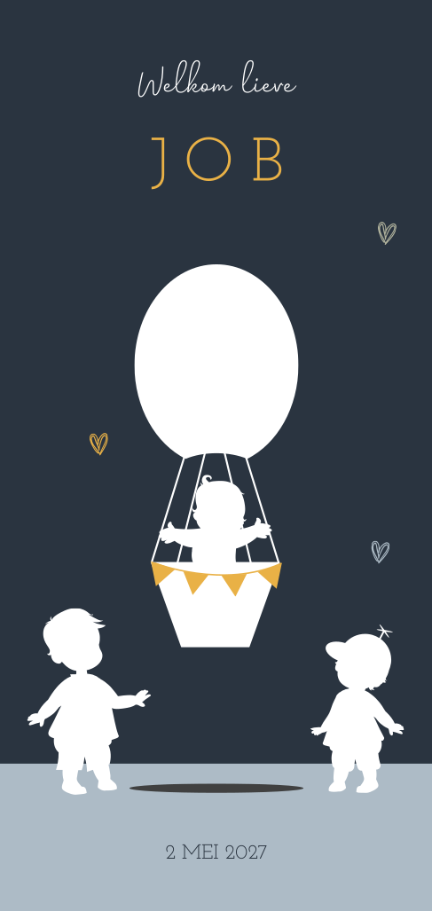 Donkerblauw geboortekaartje met drie silhouetjes. Dit langwerpige geboortekaartje is extra schattig door de drie silhouetjes van de grote broers en zijn baby broertje in de luchtballon. Rond om de luchtballon zweven er gekleurde hartjes. De naam van jouw pasgeboren zoontje staat in een trendy lettertype. Wil je een ander lettertype gebruiken? In onze ontwerptool kun je zelf alles makkelijk aanpassen. Wil je de kindjes aanpassen? Dat kan! Klik op "afbeeldingen en versieringen" en vervolgens kies je de map "silhouet familie". Hier staan alle illustraties die je nodig hebt voor dit kaartje.