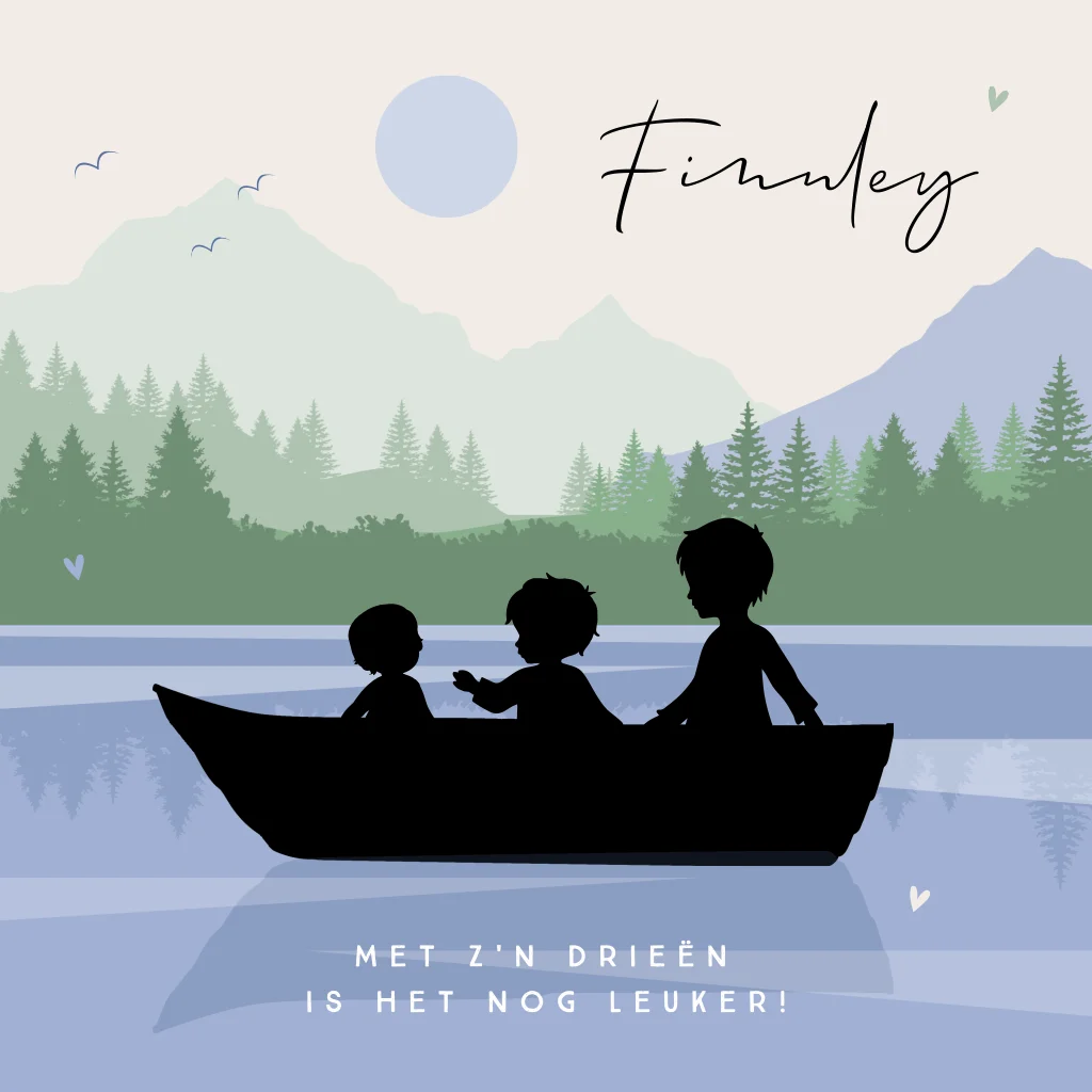 Verwachten jullie binnenkort een 3e kindje en dit keer een jongen? Ga voor dit silhouet geboortekaartje met drie kindjes in een roeibootje varend over een meer tussen de bergen en bomen. De kleuren kun je zelf wijzigen in onze handige editor.