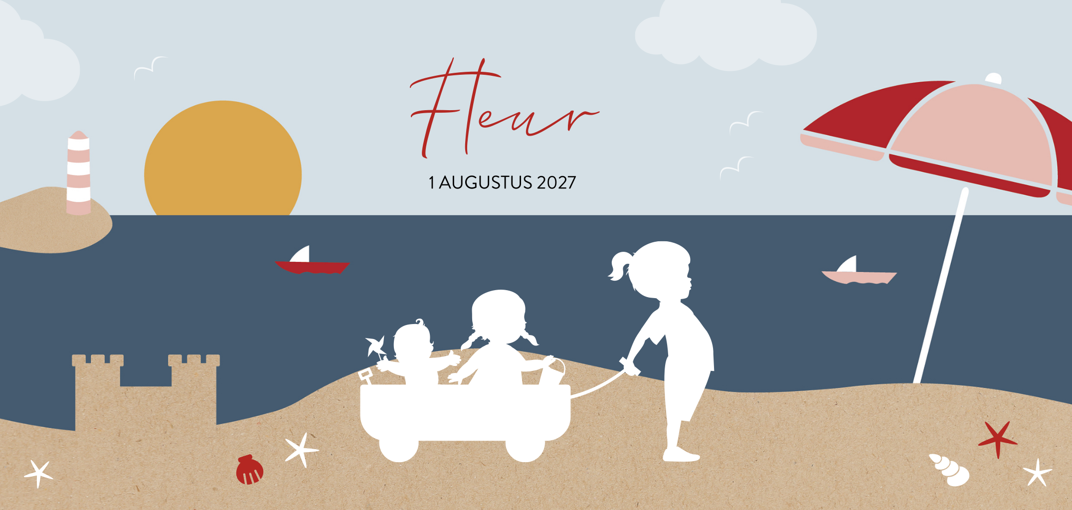 Op zoek naar een zomers geboortekaartje voor je derde kindje? Zoek niet verder! Dit hippe ontwerp met leuke silhouet illustratie is heerlijk zomers. Drie kindjes spelen met een bolderkar op het strand, omringd door schelpen en meeuwen. Pas de lettertypes aan en voeg nieuwe silhouetjes toe om de kaart te personaliseren. De silhouetjes vind je onder de tab "silhouet familie".