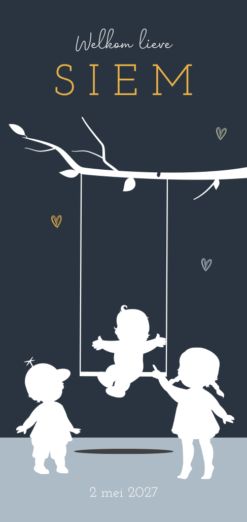 Hip geboortekaartje op langwerpig, enkel formaat met trendy silhouet illustraties. Op de voorzijde zie je een jongetje op de schommel. Hij wordt omringd door zijn zus en broertje. De vrolijk gekleurde hartjes maken het ontwerp helemaal af. Op de achterzijde is ruimte voor de geboortegegevens. Pas de silhouetjes aan door zelf illustraties toe te voegen uit de illustratie map. Bestel een drukproef en bekijk de kaart in het echt.