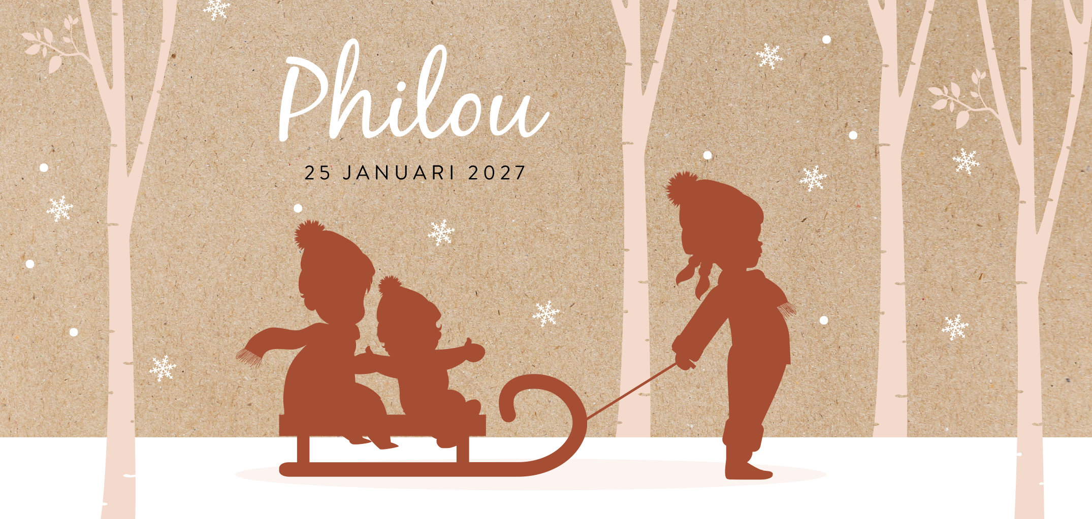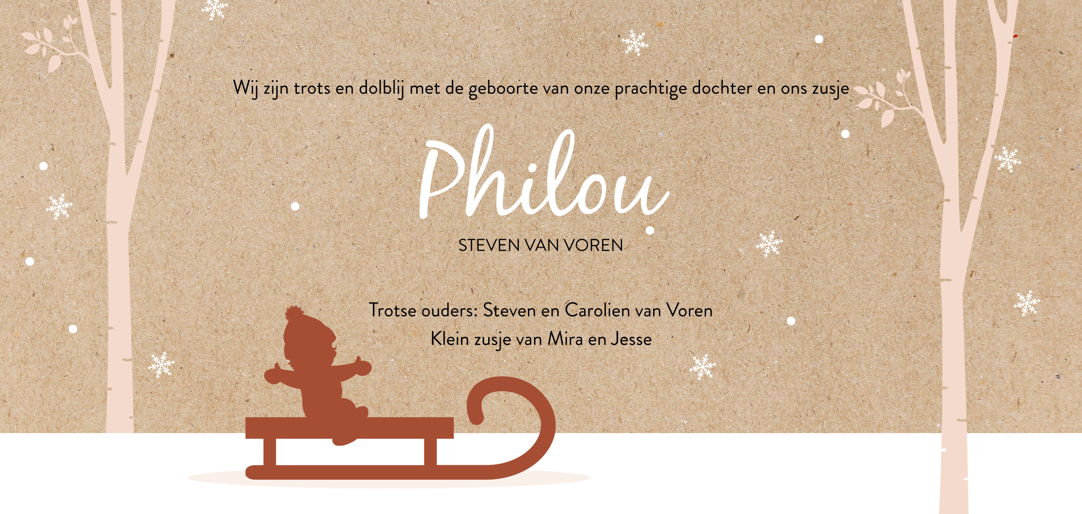 Dit geboortekaartje is perfect voor de geboorte van een winterkindje door de sfeervolle illustratie van de drie kinderen op een slee in de sneeuw. In de kaart keren de illustraties terug en kun je eventueel een leuk gedichtje plaatsen. De roestrode accenten met het roze combineren goed met de kraft(look) achtergrond en zijn helemaal hip. Je kunt de kleuren natuurlijk naar wens aanpassen. De kindjes vervang je zelf, ze staan in de designtool bij "Afbeeldingen en versieringen" en dan "silhouet familie". Hulp nodig, neem dan even contact op.