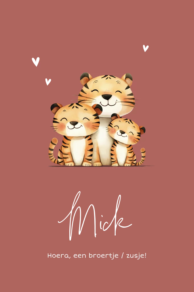 Wat een vrolijk trio! Dit geboortekaartje is ideaal voor een gezin dat een derde kindje verwelkomt. Drie schattige tijgertjes zitten liefdevol bij elkaar op een warme oudroze achtergrond, met speelse hartjes en een fijne jungle-uitstraling. De namen en details worden gedrukt in glanzende goudfolie, wat het kaartje een luxe afwerking geeft.
