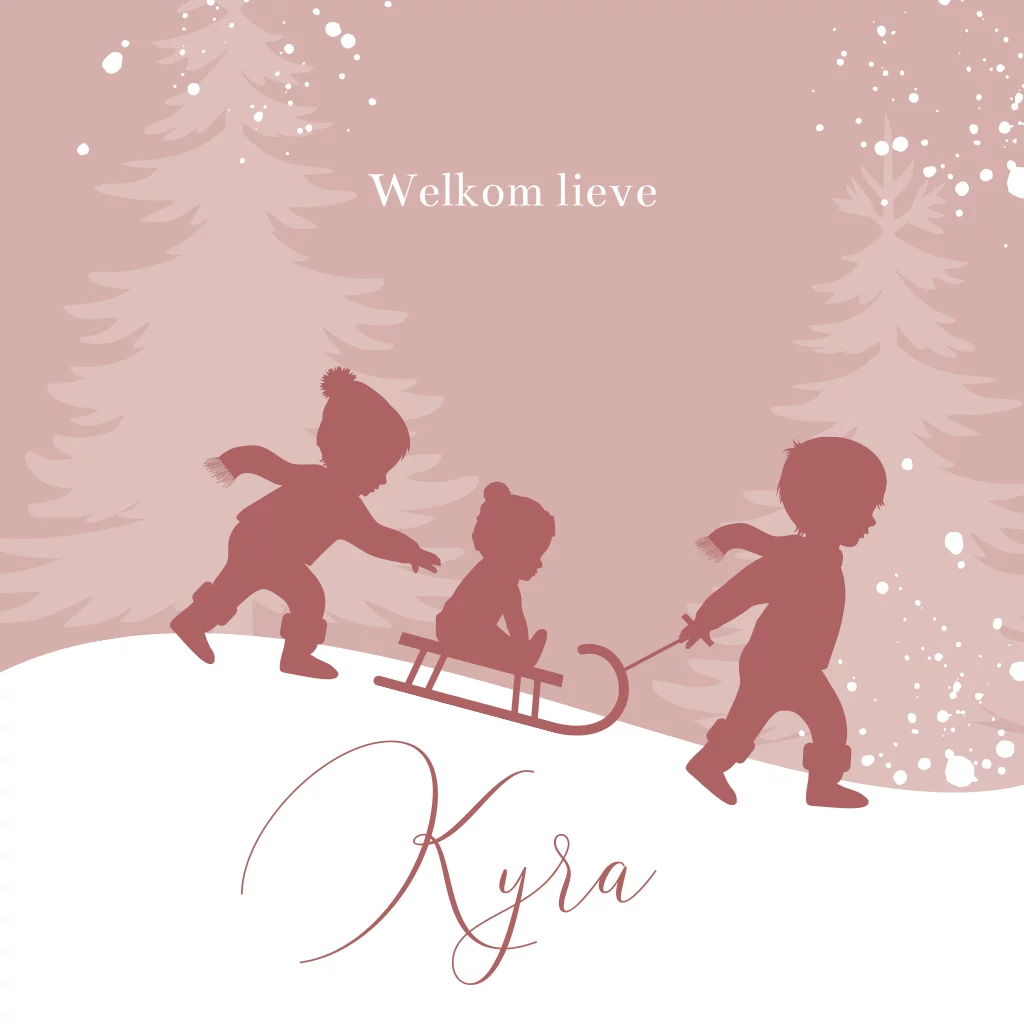 Wordt er deze winter een derde kindje geboren en is het een meisje? Dan is dit silhouet geboortekaartje met twee oudere kindjes met een slee in de sneeuw met de baby erop perfect.