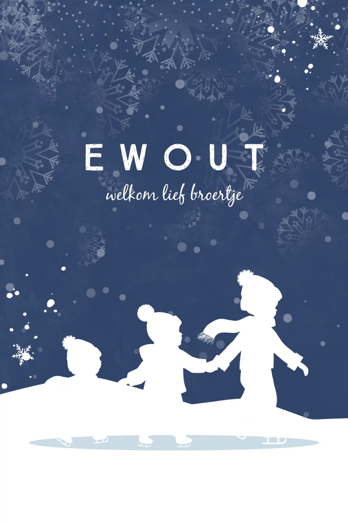 Een sfeervol blauw geboortekaartje voor een winterbaby, speciaal ontworpen voor een derde kindje. Op de voorkant zie je een klein silhouet van een jongetje op schaatsen, samen met zijn twee grote broers, afgewerkt in schitterend goudfolie. Om hen heen dwarrelen sneeuwvlokjes, terwijl de naam van jullie pasgeboren kindje prachtig glanst in folie op dit winterse ontwerp. Wil je een ander lettertype of andere silhouetjes? Pas het ontwerp eenvoudig aan naar jouw smaak in onze gebruiksvriendelijke editor. Bestel een proefdruk en bewonder het eindresultaat in het echt.