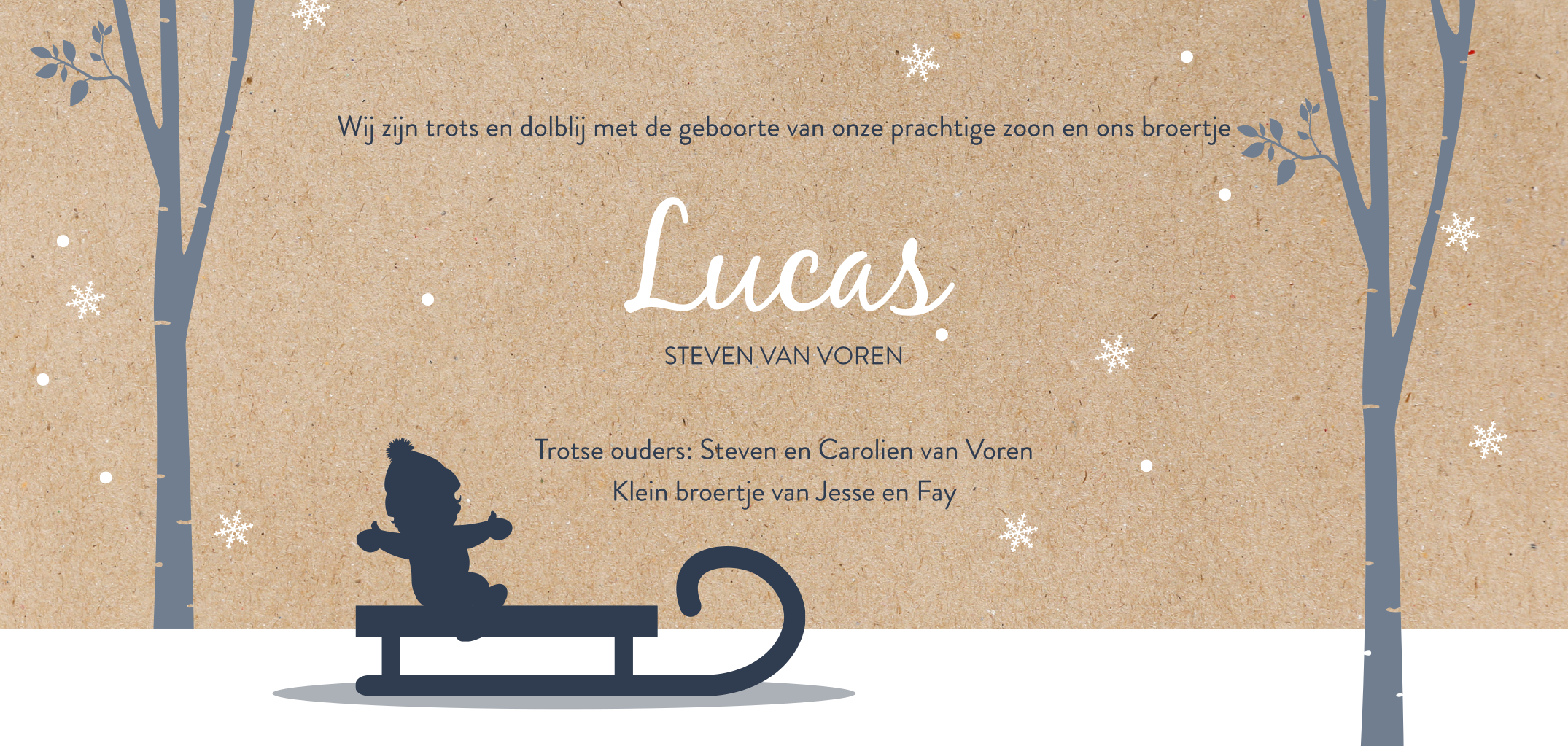 Gefeliciteerd, je bent uitgerekend in de winter van je derde kindje. Hoe leuk zou een bijpassend silhouet geboortekaartje dan zijn? Speciaal daarvoor hebben we dit hippe ontwerp gemaakt met grote zus voor de slee en haar broertje en de baby op de slee. De blauwe accenten combineren mooi met de kraft(look) achtergrond. De kindjes vind je in de designtool bij "Afbeeldingen en versieringen" en dan "silhouet familie". Pas de kaart naar wens aan en bestel een drukproef.